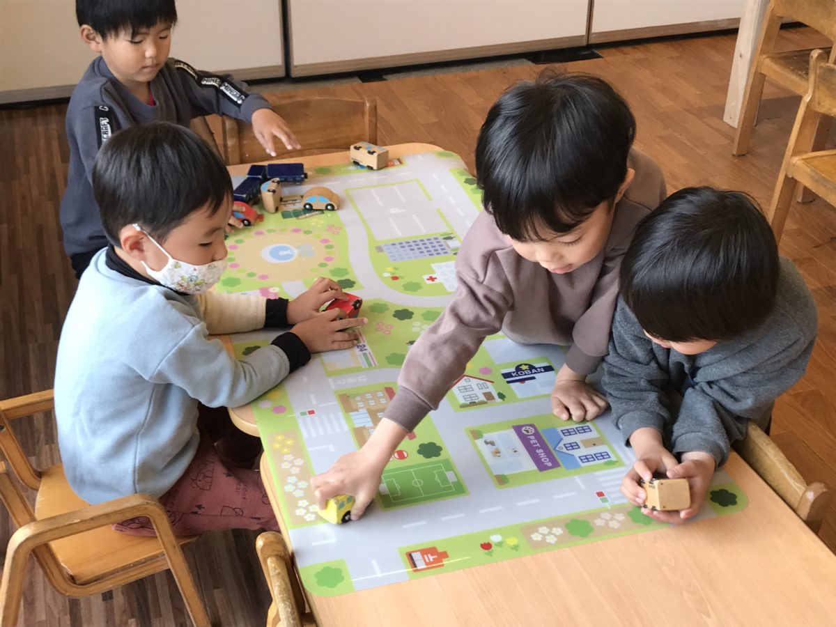 「僕の小学校はここ。ここ通って行くんやで」自分の身近な建物のお話をしながら遊んでいました。