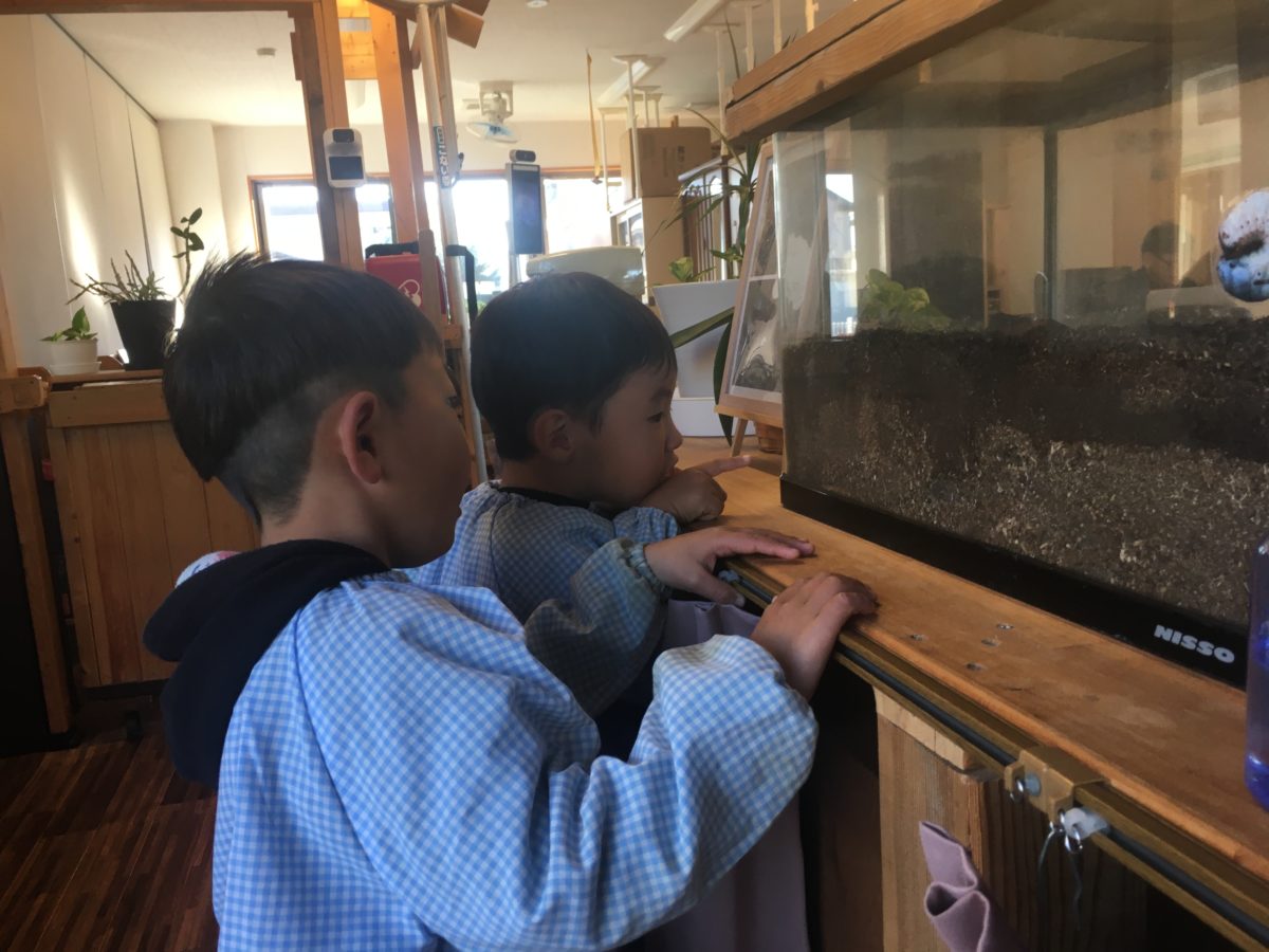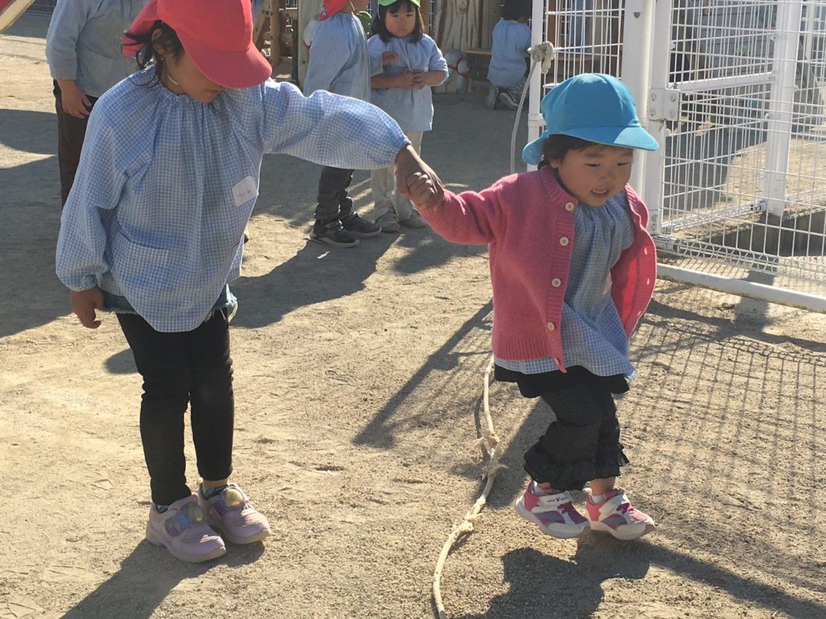 身体測定をしに事務所へ来ていた子どもたち。すると「そういえば…かぶとむしのようちゅうってどうなったんやろ?」と不意に気になった子どもたち。土の中をじっと見ながら「ここかな?でもみえやんな。」「うーんどこいったんやろうなー」と見えなくて残念な様子。すると「いまはみえなくてもいいから、またカブトムシになってでてきてな!」と土の中にいる幼虫に声をかけ、楽しみにしているようでした。そして、園庭ではさくらんぼ組VSばなな組のリレーを行いました。自分たちで順番を決めて走り出すさくらんぼ組さん。りんご組さんもばなな組さんと手をつないで走ることを楽しんでいました。大縄跳びでは「きょうな、あさおうちでおおなわれんしゅうしてきたん!」と自分の記録更新をしたくてお家で大縄跳びをしてきた話をお友だちにしている子もいました。また、「あのさいっしょにおおなわとぼー!」と今日は3人でチャレンジ!!なかなか息が合わず、はじめは1回も跳べなかったのですが、何回か繰り返しているうちに今日は7回跳べるようになり、「やったー!7かいもとべた」と嬉しそうな様子でした。そしてりんご組のお友だちも大きい子の姿を見て大縄跳びに挑戦。手をつないでもらいながらへびジャンプを楽しみ大満足な表情でした。お部屋では「サンタさんにてがみかいた?」とお友だちとクリスマスが近づいていることからそんな会話があがり「えーぼくかいてないな。かきたい」とお手紙づくりが始まりました。「でもぼく、ひらがなはかけないからえでかいてみる!」と自分が欲しいプレゼントを絵で描いている子どもたち。「やっぱりぷれぜんとのえはいるよな!あとはくりすますつりーとかもかいたほうがいいかな?」とクリスマスで思い浮かんだものも一緒に描いて楽しんでいました。