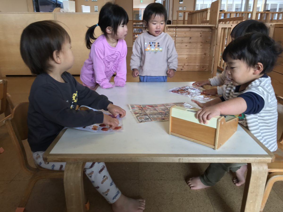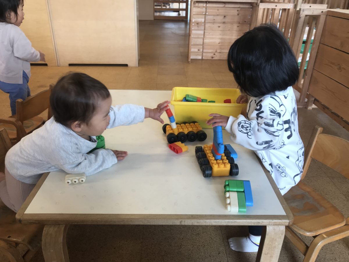 お部屋で遊んでいたお友だちは、果物や、お寿司の書いてある紙を見ながら、「これ!」と指をさしていたのでレジを出すと「いらっしゃいませー」「どうぞー」とおみせやさんごっこが始まり、お友だちとのやり取りを楽しんでいました。ブロックを使っていたお友だちは、ブロックを組み合わせて車を作っていると、そばにいたすいか組のお友だちも「つかいたい!」と言っているように手を伸ばす姿がありました。