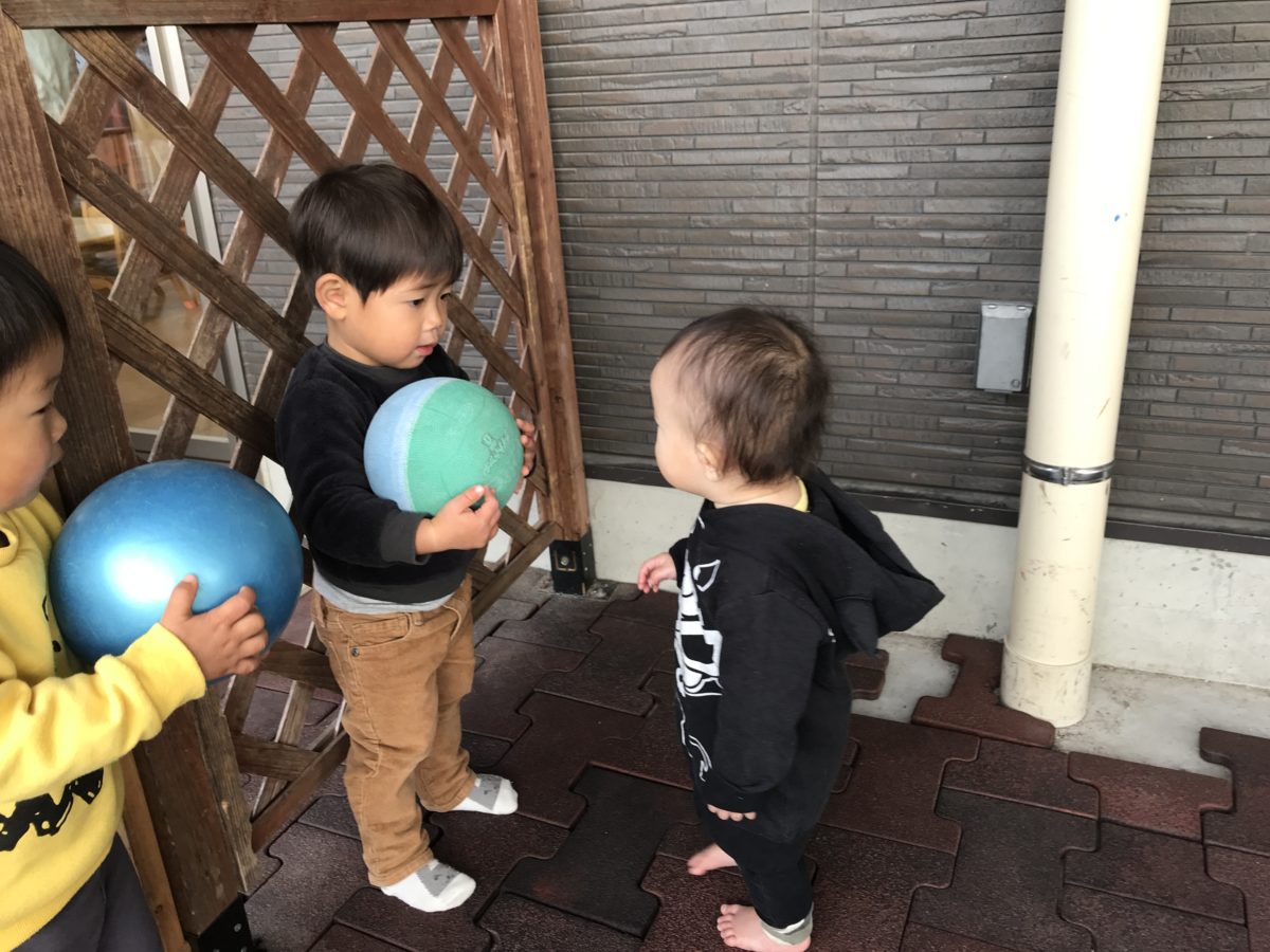 テラスでボールやひもを引っ張るおもちゃで遊んでいた子どもたち。おもちゃを探していたお友だちに、「どーぞ」とおもちゃを渡し隣で一緒になって遊んでいました。すいか組さんもボールを使っているいちごさんを見て、ボールを「かーしーて」というように、使っている子の前まで歩いていくと、「ぼーる?」(貸してほしいの?)と聞いて手渡す姿がありました。
