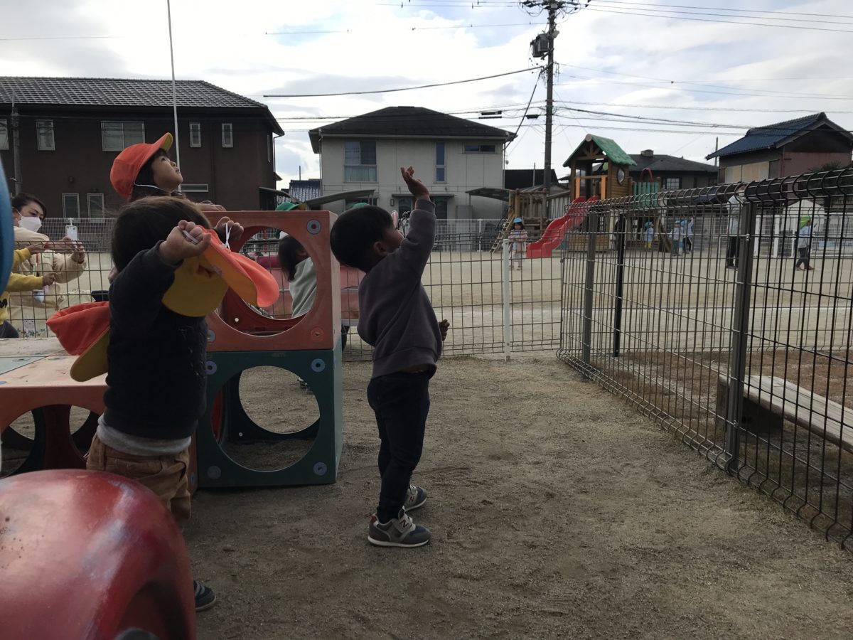園庭に出ていたお友だちは、ヘリコプターの音が聞こえると空を見上げて「バイバーイ!」と手を振ってみたり、「あ!ヘリコプター!」と声を出していました。