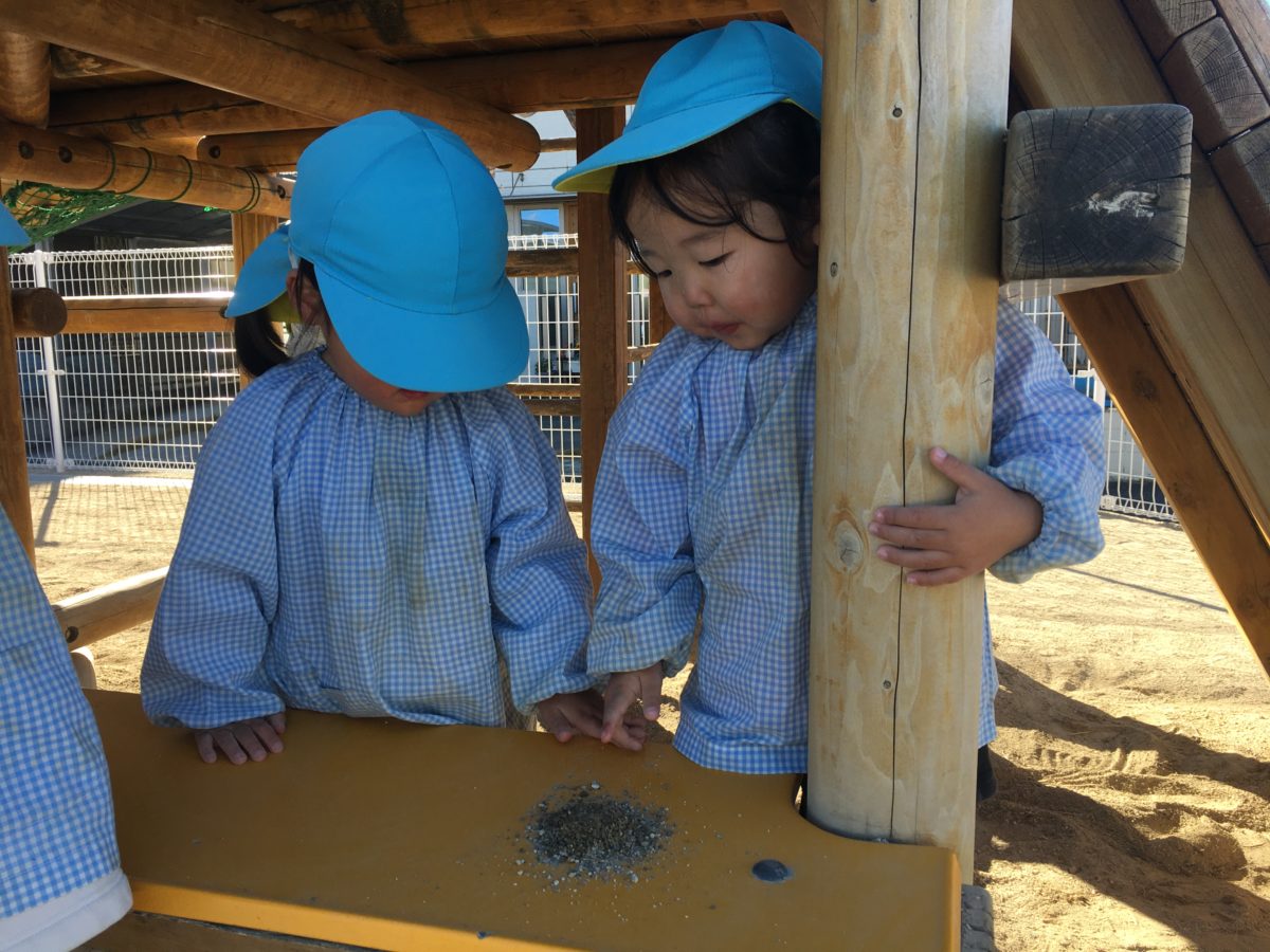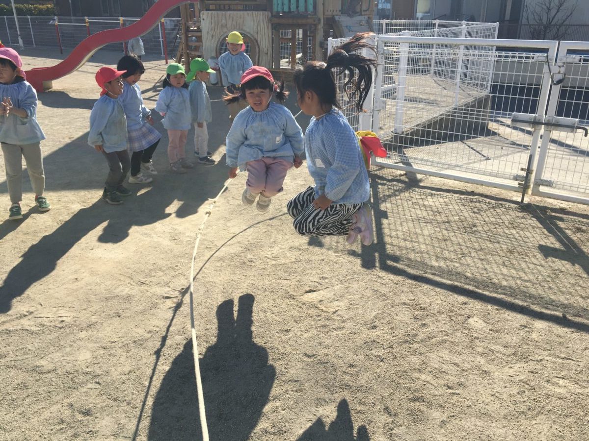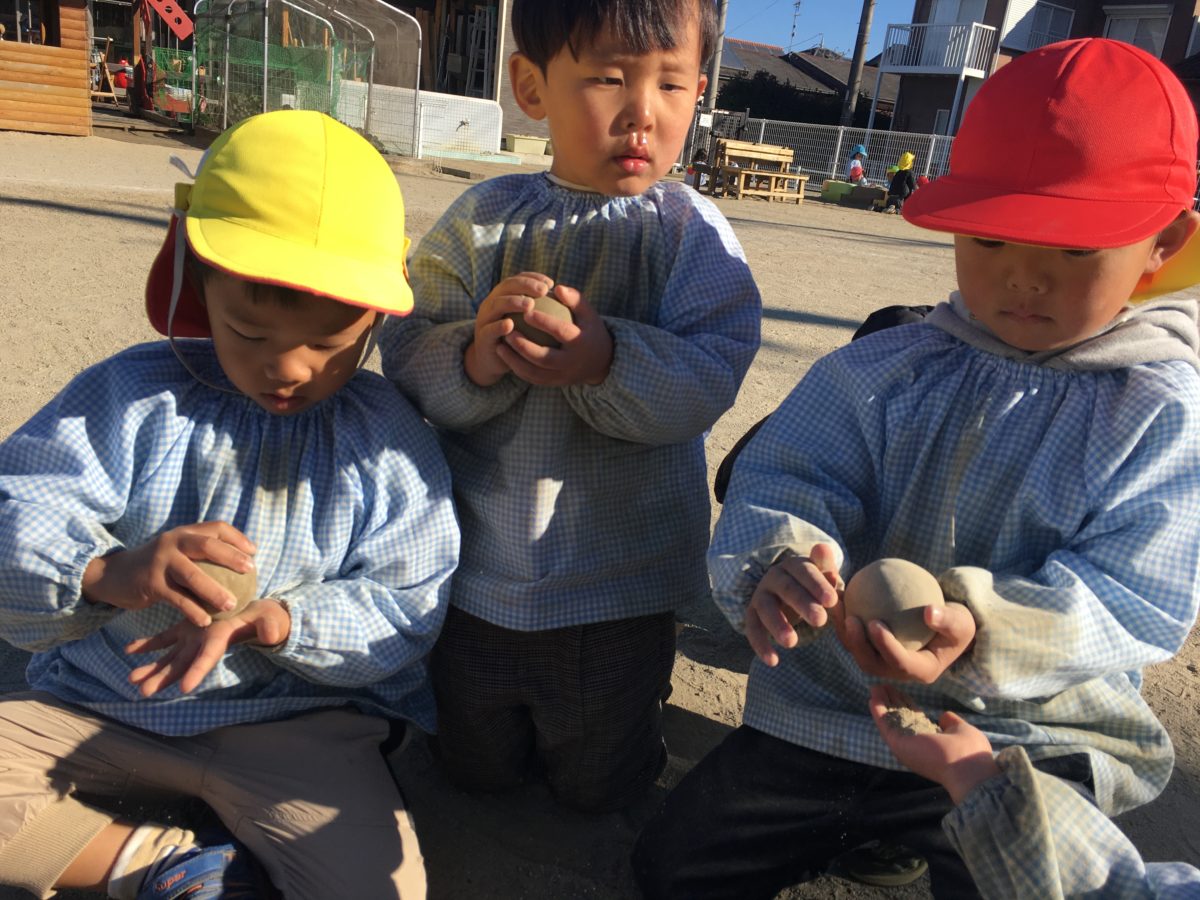 昨日、きれいな形の泥団子を作った子どもたち。「きれいにつくれたから、こわされたくない!」と話し大事にしていた泥団子。1日置き今日泥団子の状態を見てみると…。「なんかきのうよりもかたくなってる。」と水分も抜けて泥団子がかたくなったと感じたようでした。そして「これにしろいすなかけたらいいんだよね?」とさっそく白いサラサラな砂をかけて磨いていくと「ピカピカしてきた!」「なんかくろかったけどしろいだんごになってきた。」と泥団子の様子が変わってきたことに子どもたちも嬉しそうでした。水で書いた線を線路に見立てて遊び始め「N700けいがしゅっぱつしまーす!」「○○くんもつながってよ~!」とお友だちがつながり「しゅっしゅっぽっぽー!」と線に沿って進んでいき、「つぎは〇〇えき~!」と自分たちで駅も作り電車ごっこも楽しんでいました。また今日も大繩に挑戦したくて仕方がない子どもたち。お友だちの記録や前日の自分の記録を越したい様子。「きょうは30かいとびたい!」と自分で目標を立てる子もいました。みんなで回数を数えあい、また「がんばれ!がんばれ!」と応援する声も聞こえ大縄跳びが盛り上がっています。また「いっしょにとぼうよ~!」とお友だちと2人跳びにも挑戦し「ふたりでとぶのもおもしろいね~!」と違う跳び方をすることも楽しみながら「もっととびたい!」「今度はさっきよりもとびたい!」と記録更新も目指す子どもたちでした!!