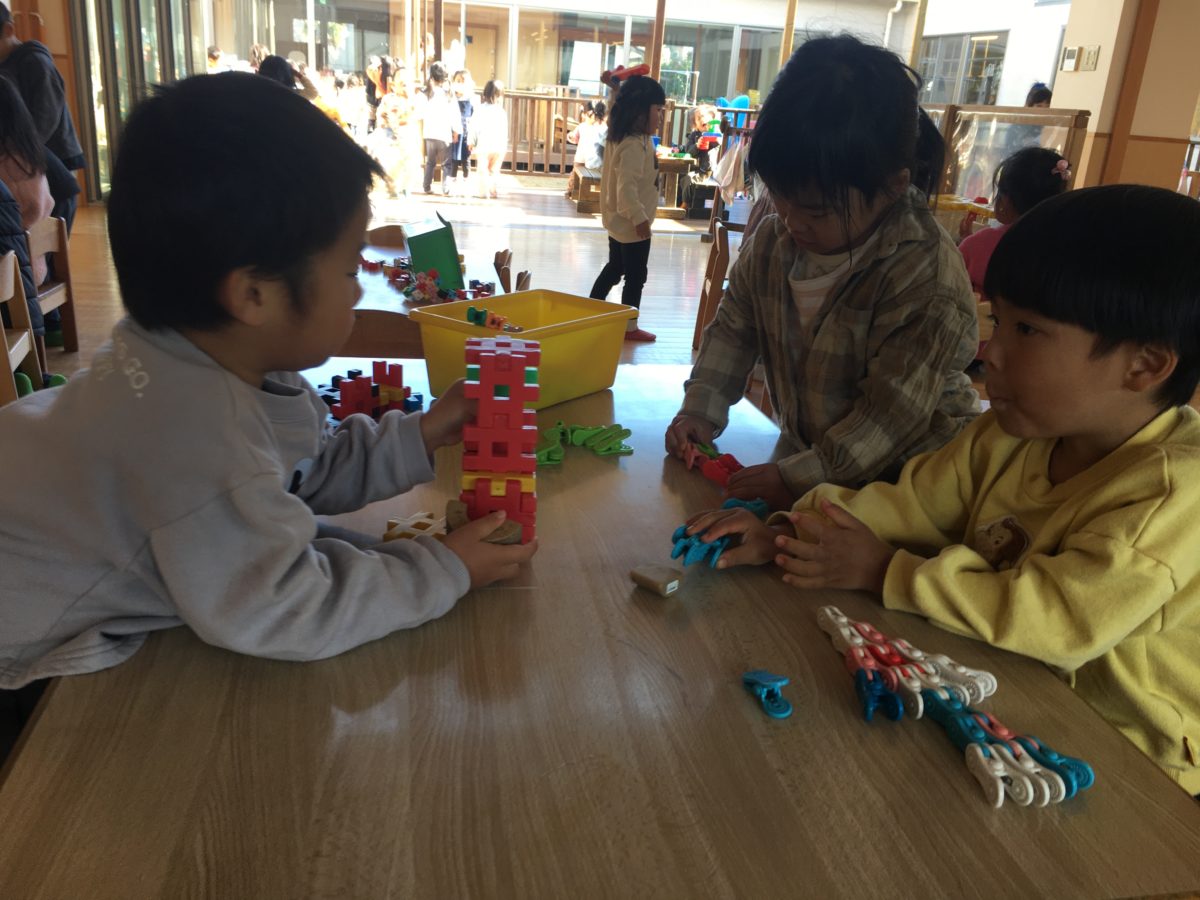 なにつくるー?このブロックとこれ組み合わせる?と相談中…