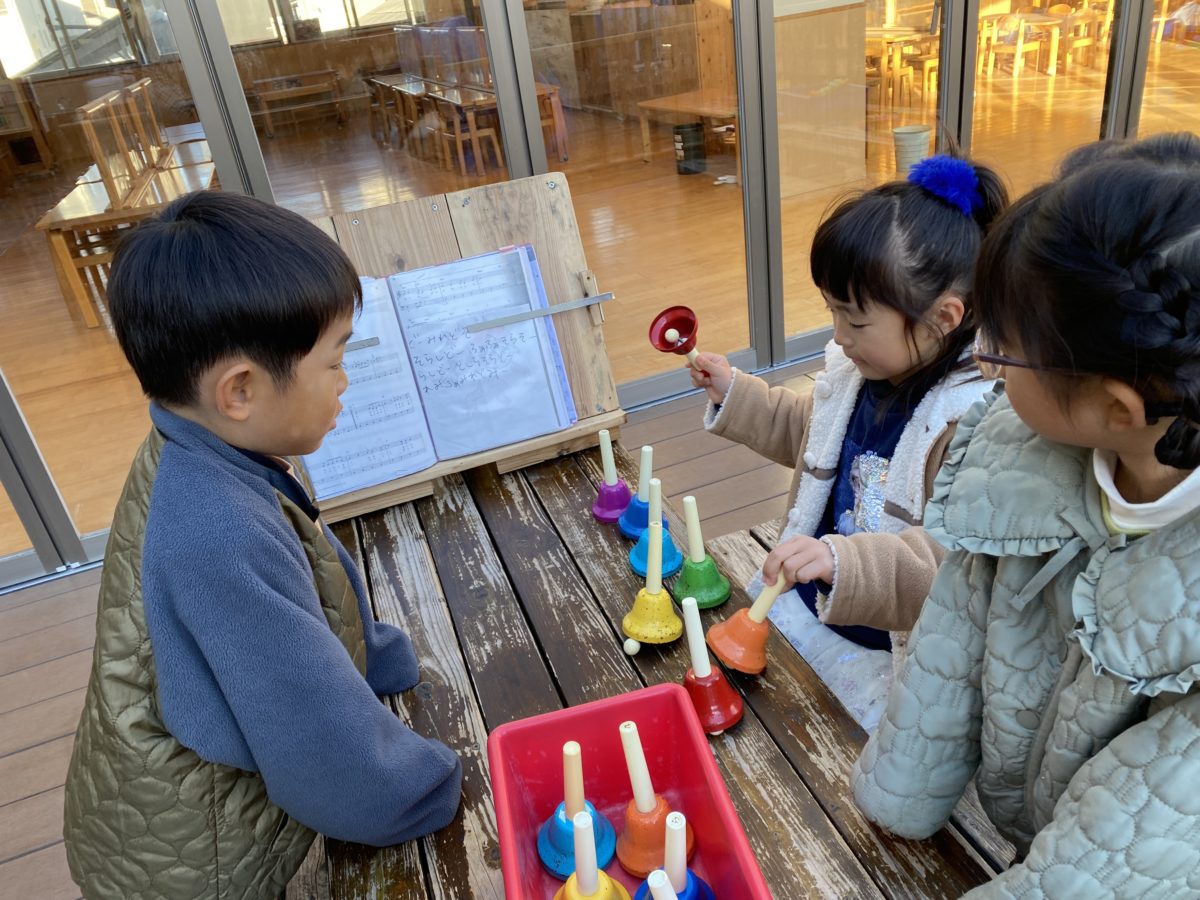いつも歌っている曲のベルの演奏に挑戦しました。ど・れ・み・ふぁ・そ・ら・し・ど・・・と順に並べて、演奏しやすいように工夫していました。
