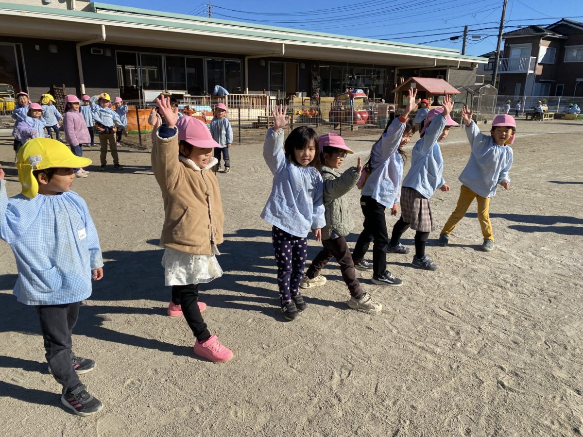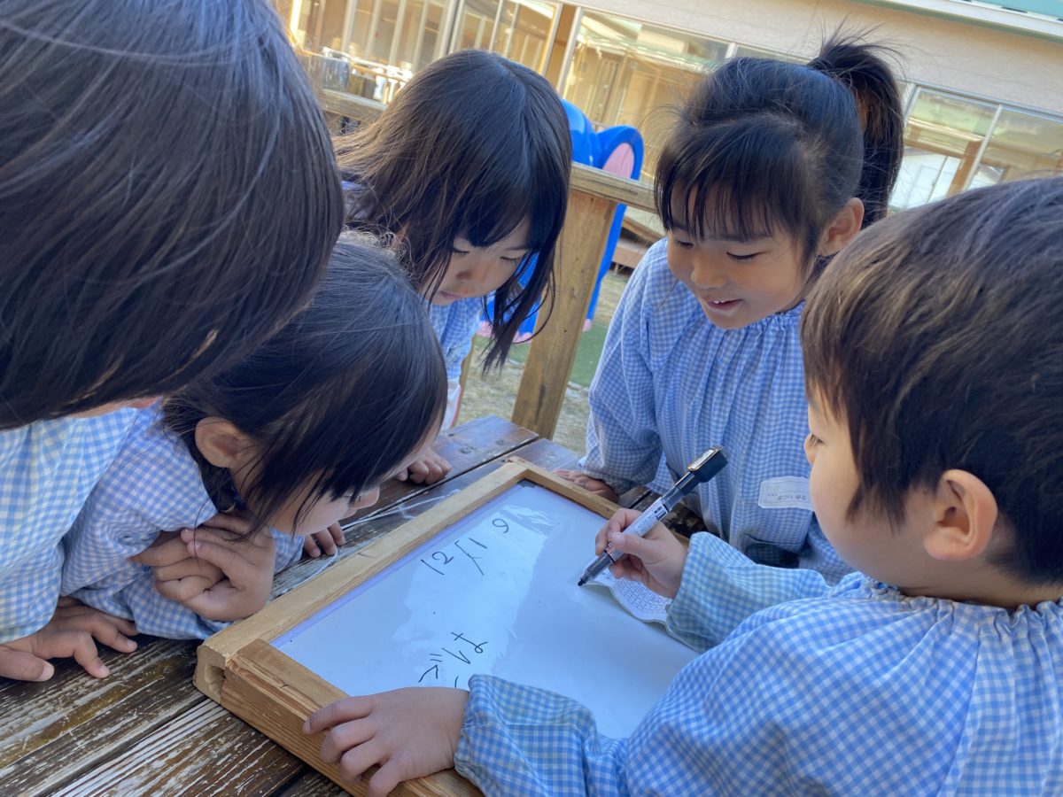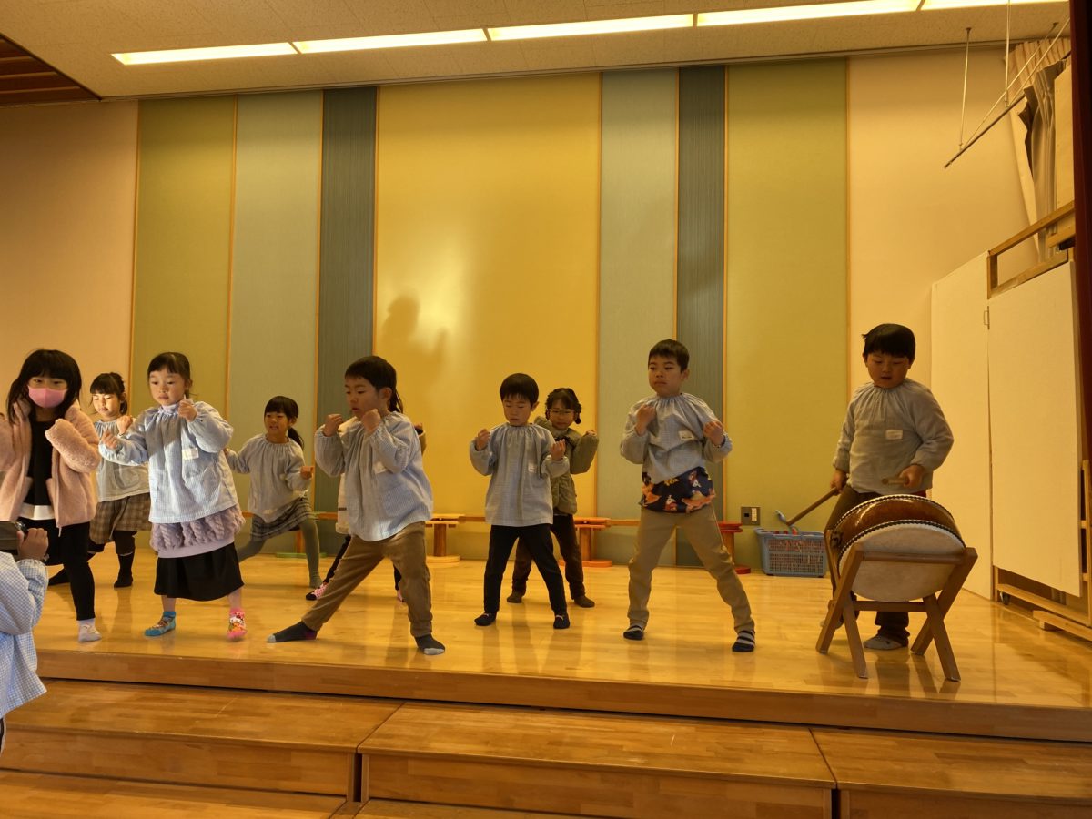 「あしたはくりすますかい!」「サンタさん、くるかなー!?」「ほんもののさんたって・・」とお友だちと一緒にユニークにイメージをふくらませながら会話をして、明日を楽しみにする声が聞こえました。習字教室のみんなの作品がたくさんになってきたので、一人ひとりが自分で最高の三枚を選びました。「えーどれにしよう!」と悩んだり「あーこれもかいたなー」と思い出したり、「このおてほんすきやで。」と先生のお手本を選ぶお友だちもいました。「〇〇って、かいたの?」とお友だちの作品を気にかける姿や「こんど〇〇って、描いてみよ!」との声も聞こえました。また次回の習字教室を楽しみしていました。またダンスと一緒に太鼓もコラボして踊りました。かっこいいイメージを持って踊ったり、太鼓のリズムや叩き方の立ち振る舞いを工夫していました。そんなめろん組さんの舞台での姿にばなな組さん、さくらんぼ組さん、りんご組さん・・・が「もっとみたい!」と集まってきていました。鬼れんちゃんリレーでは久しぶりにめろん組さんだけの三人組で行い、「まだ〇〇くんとしたことない!」と組んで優勝したことのないお友だちを探してチームになりながら、めろん組さんならではの迫力で全力で走っていました。