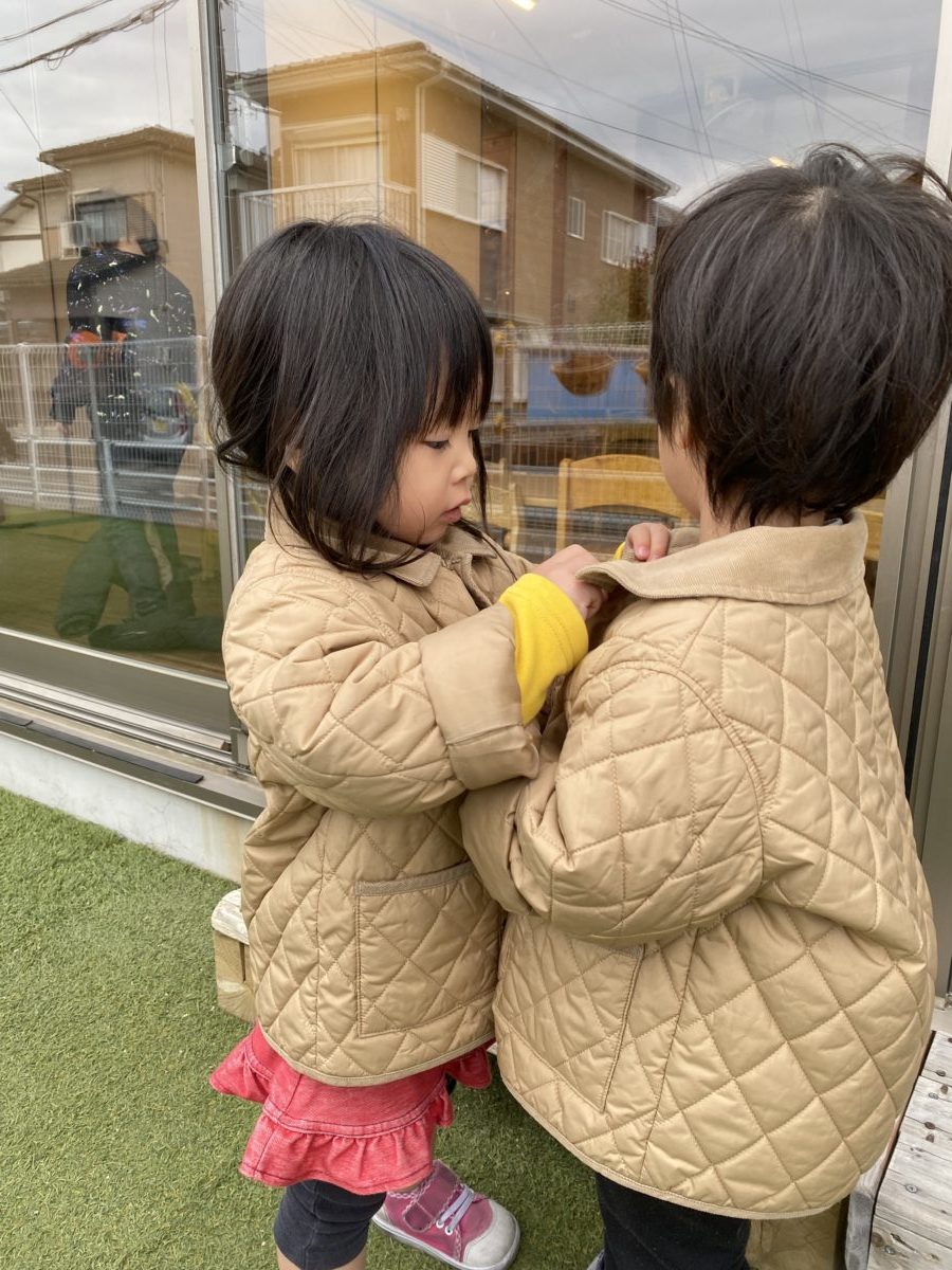 「これは何色でしょう?」「赤!」・・・「じゃ、次の問題~!これは何を作ったでしょうか?」「ほねほね列車!」などとなぞなぞごっこをしている会話が聞こえてきてとても楽しそうでしたよ。小さいお友だちにも分かるようにヒントを付け加えてあげたりその様子がとても微笑ましかったですよ。テラスに出てすぐに寒いから走ろう!!と、相談して端から端まで走っていました。寒かったけどあたたかくなった!!とその後も繰り返していました。途中で葉っぱを見つけ、どちらの方の葉っぱが大きいかな?と重ねたりして比べていました。「こっちの方が大きいな!いや、同じくらいや!」などと、会話をしている姿が微笑ましかったです。