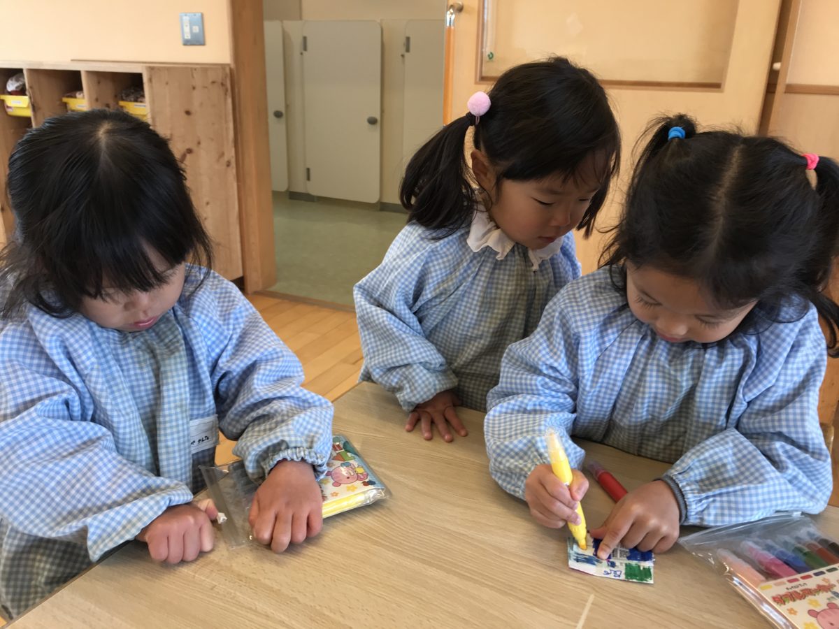 「この折り紙いろんな色で塗るの!」とマーカーを使って様々な色を塗るのを楽しんでいました。