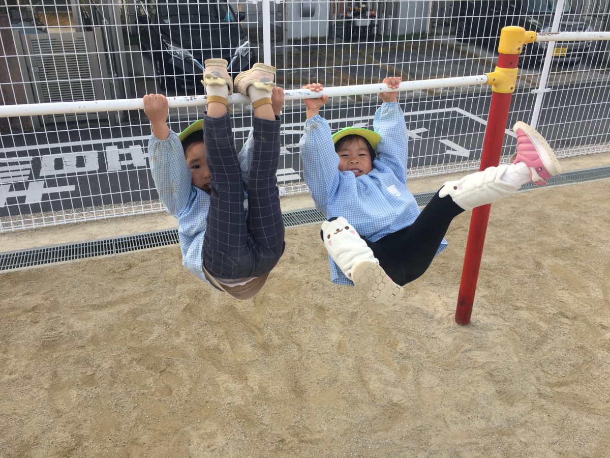 「ここふきふきのおてつだいしたい!」と大きい子の真似をして、お手伝いしてくれたのはりんご組のお友だち。「ここぬれてる。」と濡れている部分を見つけて雑巾で拭きだし「みてーおみずなくなったの。」と水気がなくなりきれいになったことを喜ぶ子どもたちでした。園庭では、ペアリレーを行いました。「めろんさんといっしょにはしれるの?」と憧れのめろん組さんと一緒に走れることを楽しみめろん組さんも「ちいさいこのすぴーどではしるわ」ときちんと走る速度も考え安全に走ろうとする姿もありました。鉄棒ではぶら下がってみたり地面をけり上げ、逆上がりに挑戦しようとする姿などもありました。「おねえちゃん、さかあがりできるでやってみたいんやけど、なかなかできやんな」とできるようになりたくて何度も挑戦する子どもたち。そしてドッヂボールでも「いれてー!」とばなな組のお友だちも一緒に入れてもらい当たらないように逃げる姿がありました。それでもめろん組さんの力強いボールに当たってしまうと「あーあたってしまった。くやしい。」と当たってしまったことに悔しさを感じながらも遊びを楽しむ様子も見られました。