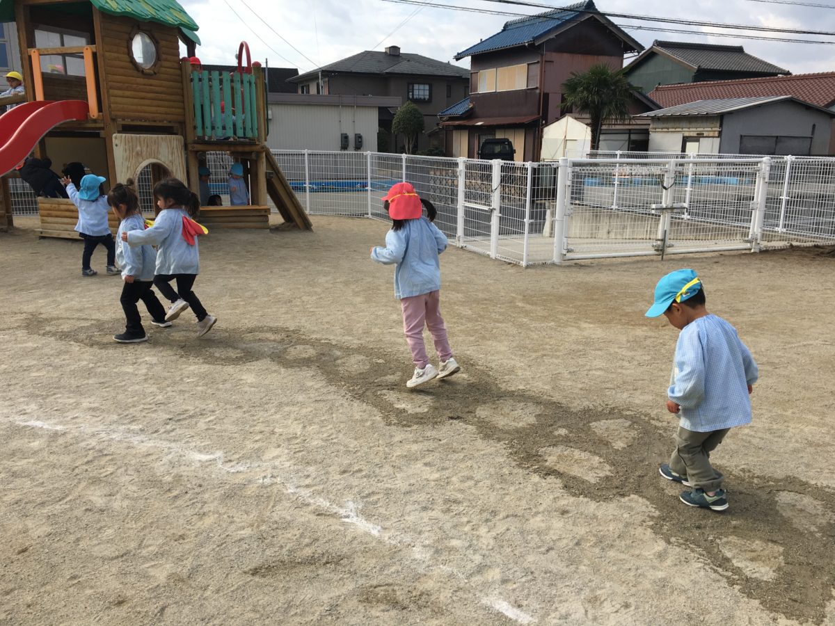 自分の準備が終わると…「あかちゃんのおせわしたいです!」と小さい子の部屋へやってきたさくらんぼ組さん。「○○ちゃんおはよ!」とあいさつをしたり、「このおもちゃであそべるかな?むずかしいかな?」と小さい子がどのおもちゃで遊べるか考えたり「これつかう~?」と途中まで組み合立てたブロックを渡してあげようとする姿なども見られました。さくらんぼ組さんも小さい子のお手伝いやお世話をして姉さん気分を味わっていました。ブロックを使って、今日はクリスマスツリーを作っていました、「きょうのくりすますやったらいいのになぁ~」とまだまだクリスマス気分を味わいたい子どもたちのようです。そのツリーを見て「めろんさんってなんでもつくれるからすごいよね。」と話す声も聞こえてきました。園庭ではダンス鬼ごっこ♪ポーズを決めるところでは「ピース!!」と声に出しながら手を上へ上げてかっこよくポーズ!!を決めた途端…音楽が止まり「うわ!にげやな。」と慌てて逃げる子どもたち。すると「ダンスたのしくてにげるのわすれるところやったー!」と話しながら捕まらないように逃げていました。そしてめろん組さんがボールをキャッチする遊びを以前していて、今日挑戦していたばなな組さん。最初はボールが全然違うところへ飛んで行ってしまい、キャッチがなかなか出来ず「むずかしいー!」と話していましたが少し低めに投げてみると「あっ!キャッチできた♪」ととっても嬉しそう。そこから少しずつ高さをあげていきながら楽しんでいました。