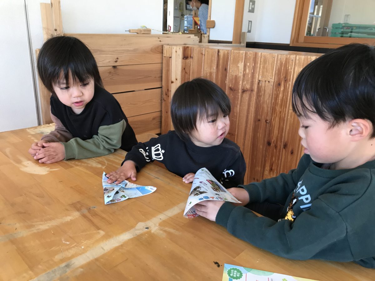 今日は「折り紙でなんか作りたい!」と言うので、折り紙とのりを用意しました。作りたいものがあっても作り方が分からないようで、「カエルはどうやって作るの?」「知っとる!教えたろ!」と答え、折り紙の折り方を色々知っている子が折り方を教えてあげて、好きな物を作る姿がありました。その作ったもので遊んだり、紙飛行機を作ったお友だちは、遠くまで飛ばしたい!と言うので、外に出て紙飛行機を飛ばす事にしました。風が強かったので紙飛行機がびゅうっと飛ばされると、「危ない!紙飛行機とんでく!」「紙飛行機とんでいくとあかんから、こっちでとばそう!」と園舎も壁に近づいて風のあまり当たらない所に移動して紙飛行機を飛ばしていました。それでも時折大きく吹く風には対応できなかったようで、「やっぱりめっちゃとんでくから片付けとこ!」と一緒に飛ばしていたお友だちと一緒に鞄にしまいにいってました。