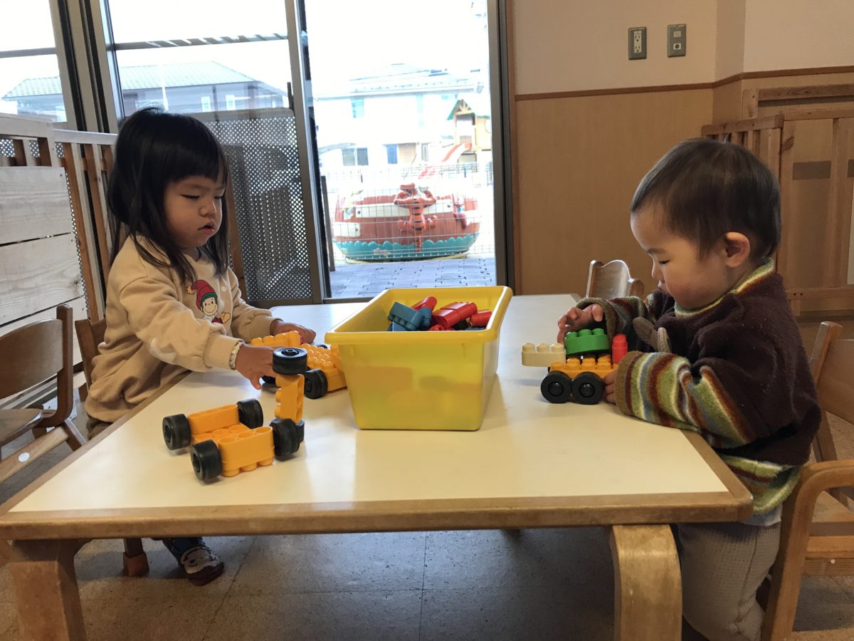 ブロックで遊んでいたお友だちはタイヤのついたブロックを組み合わせて、車を作って机の上を走らせていました。それを見ていた、すいか組のお友だちも見よう見真似でブロックを組み合わせていくのを楽しんでいました。