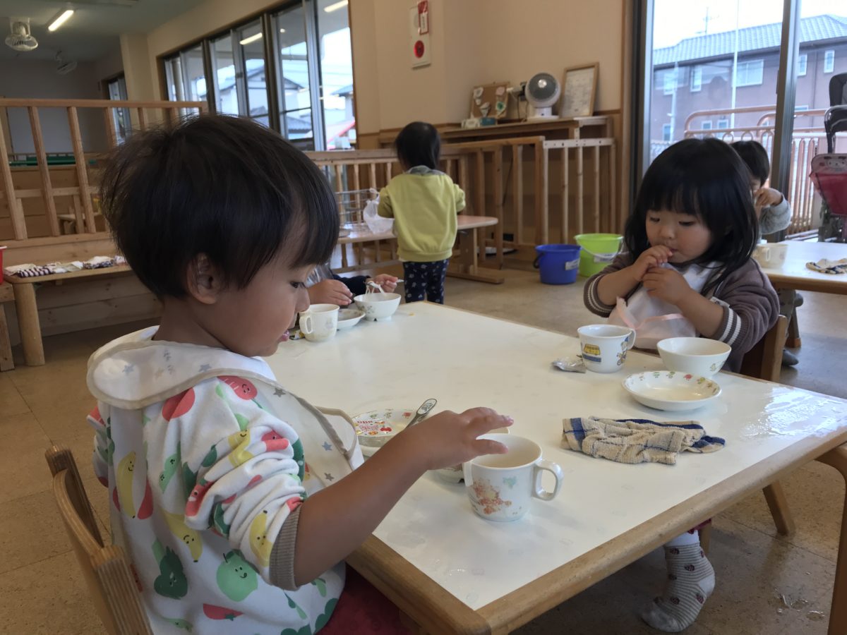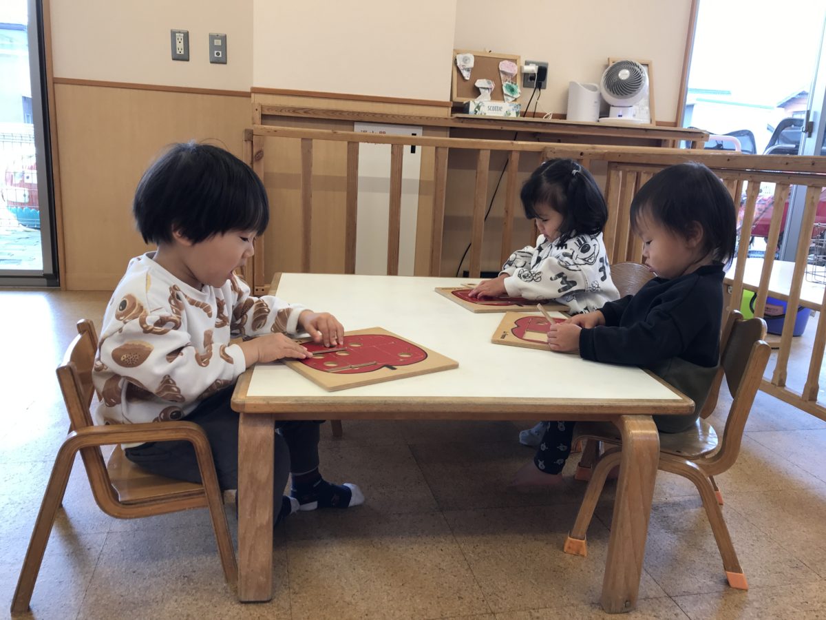 今日は雨が降っていたのでお部屋で遊んでいた子どもたち。カメの形になるパズルを出すと、どこにはまるかな?と角度を変えて繰り返し、お友だちと「ここかな?」「ここだよ!」とお話ししながら一緒になって完成させようとしていました。りんごの形のパズルをしていたお友だちは、「りんご!」と言いながら完成しては崩してを繰り返し、お友だちにパズルを「はい、どーぞ!」と渡して一緒に楽しんでいる様子もありました。