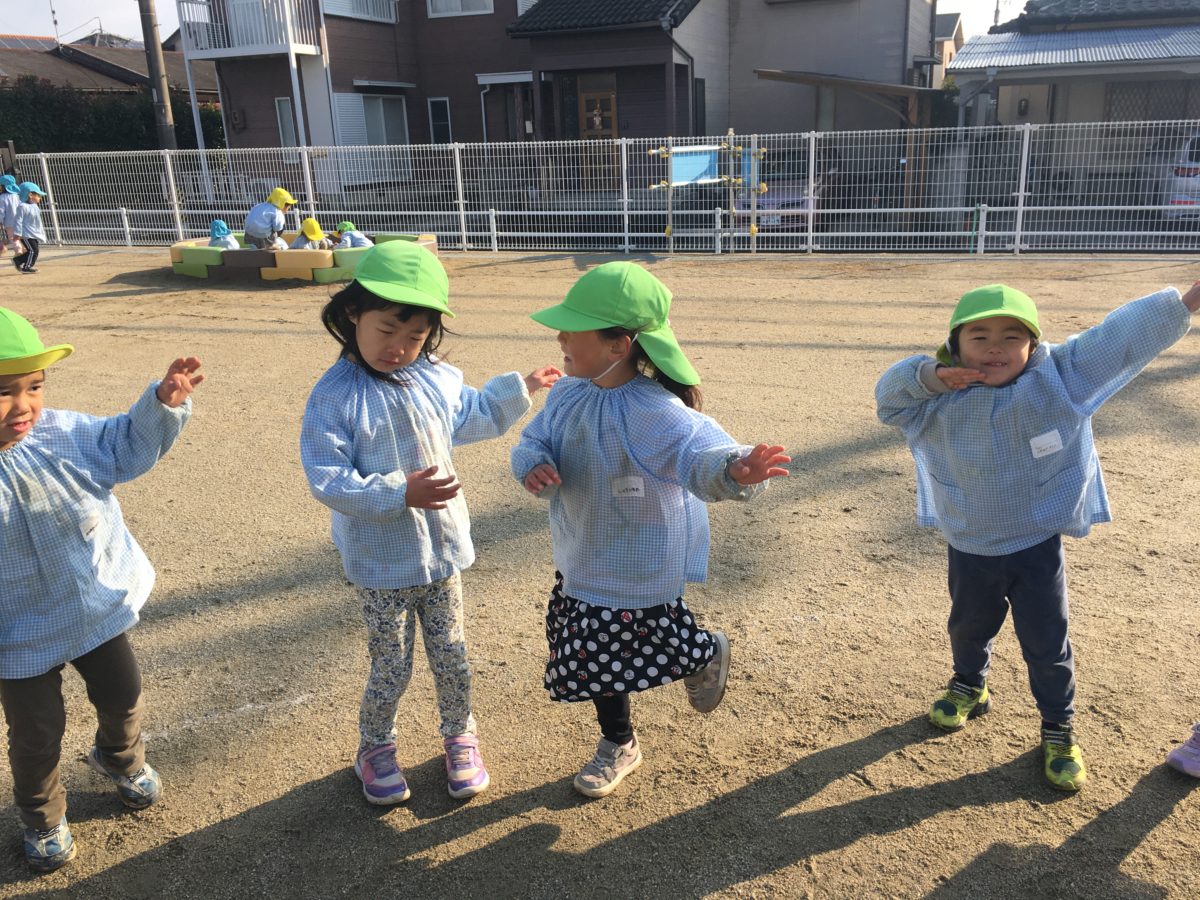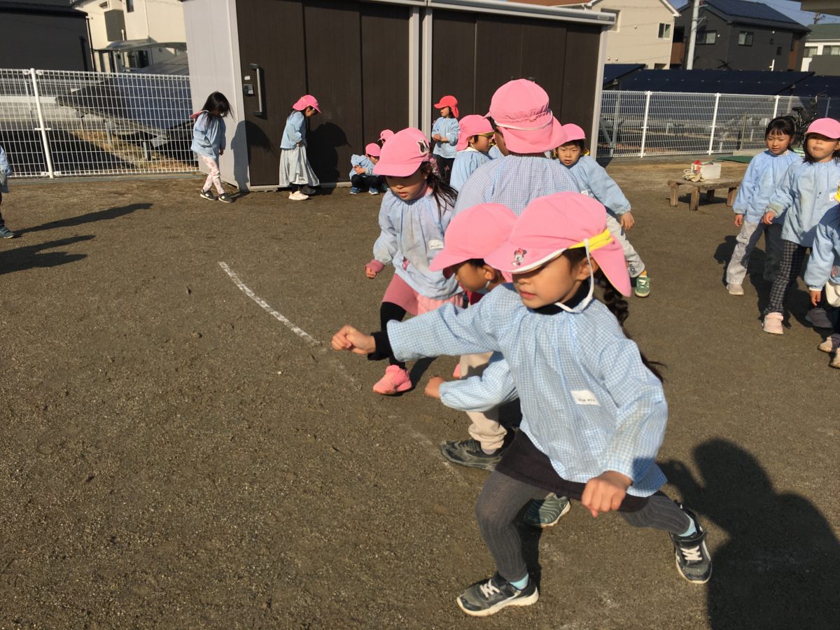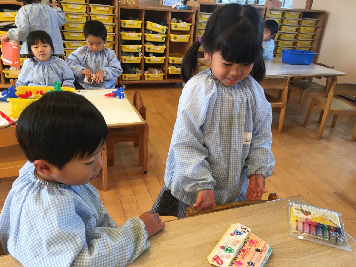 「ひさしぶりにだんすおにごっこしたい」と話す子どもたち。すると「「びんばんばんのダンスしたいな」とどのダンスで鬼ごっこがしたいのかも話す子どもたちの様子がありました。「びんばんばんひさしぶりやな。どうやっておどるんやっけ?」と言いながらも曲が流れると自然と体を動いて「おもしだしたー!!」と楽しそうに踊り曲が止まると一生懸命逃げていく子どもたち。お部屋では、折り紙でダルマを作り「これいろぬるわ~!!」とかわいく顔を描いたりカラフルな色あいにする様子も。「かわいくできちゃった~!」と嬉しそうに話す様子もあり、子どもたちそれぞれのかわいらしいダルマが出来上がっていました。そしてお餅の写真を見ながら「おもちがいっぱいのってるね。」とお餅の写真を見ていたところ「あーぼくこれ、おばあちゃんのいえでたべた!!」と指さしていたものは・・・お雑煮!!子どもたちもお正月にお雑煮やお餅つきをした話などが聞こえてきたりとお正月を楽しんだ様子の子どもたちの声もたくさん聞こえてきました。