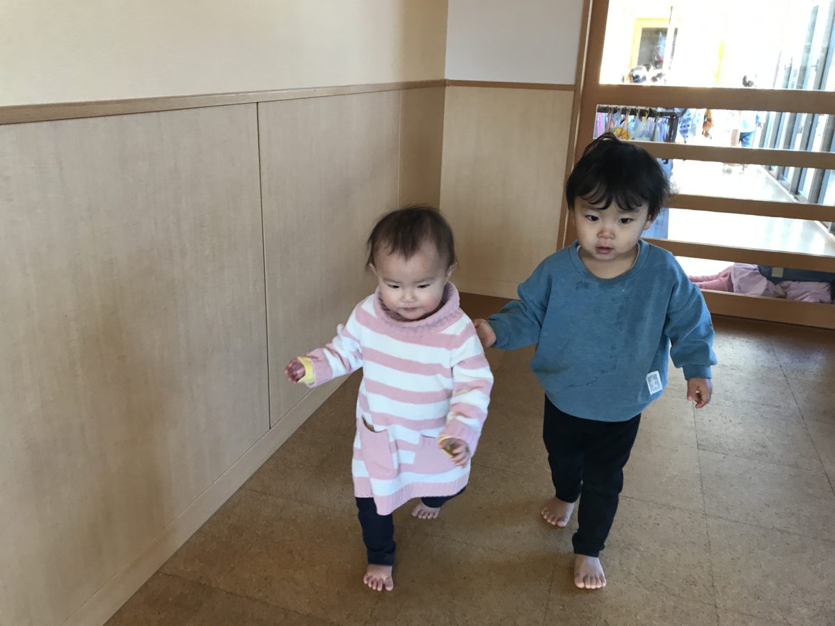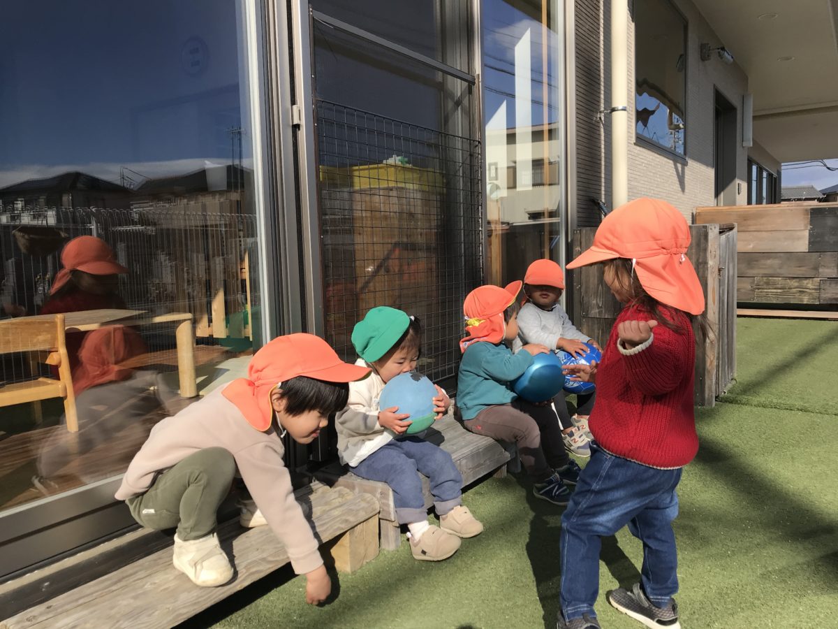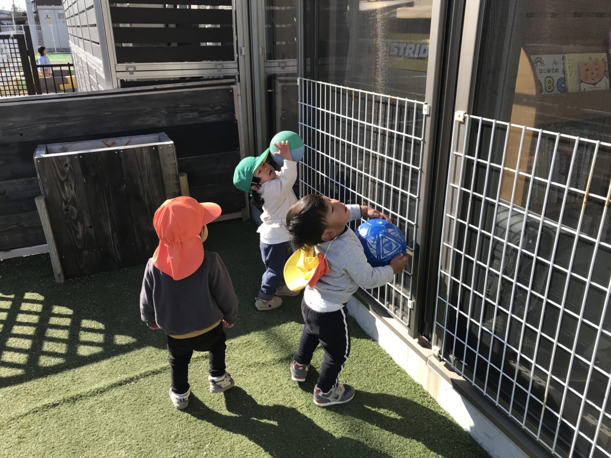 お外に出て遊んでいたお友だちは、広い園庭まで行き、「よーいどん!」と走って園庭の端から端まで行ったり来たりしながら、元気に体を動かして遊びました。ボールを持っていたお友だちは、転がしたり蹴ったりして遊んでいる中でボールを持ち上げて壁に伝わせ転がしているお友だちを見て、一緒になって壁にボールを伝わせていました。上からボールが落ちてくるのが楽しかったのか、何度も繰り返して楽しんでいました。