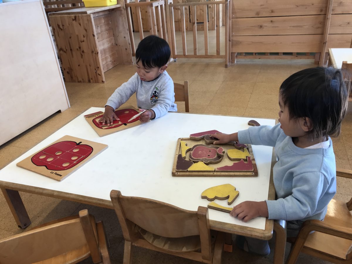 お部屋でパズルをして遊んでいたお友だちは、「ここ?」とパズルをはめていくと「ゴリラ?」「サル?」といろんな動物が出る中、完成に近づくと「ゴリラ~!」と正解が分かって喜んでいました。