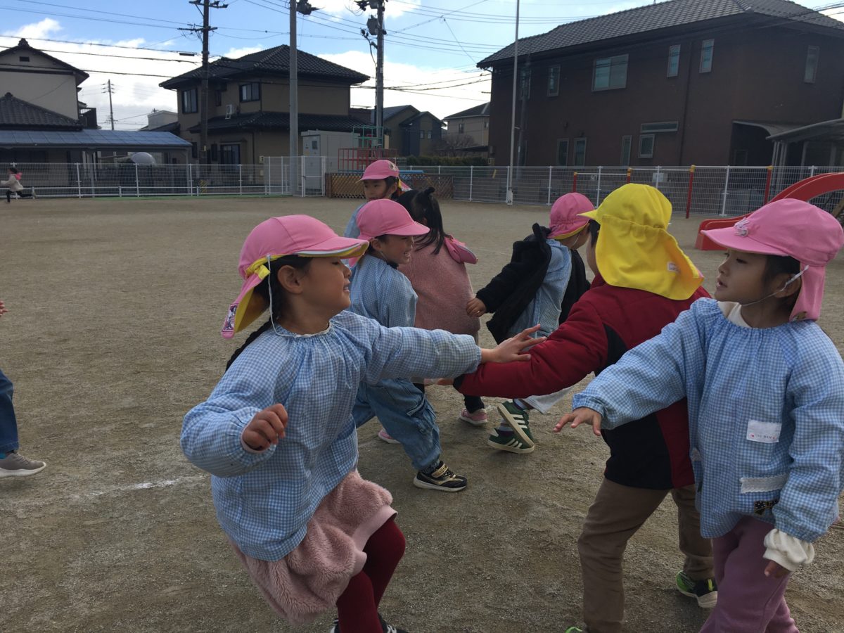 今朝、お友だち同士でカルタ遊びをしてい子どもたち。すると「みんなでカルタ大会したい!」と話す声があり読み手と取り手に分かれてカルタ大会が始まりました。読み手の子たちも大きな声でわかりやすく札を読んだ後にも「ながいはなの【な】」と繰り返し取り手の子たちに伝える姿がありました。取り手の子も見つけるとすかさず「はいっ!」と遠いところにも腕を必死に伸ばして札を取っていました。なかなかみんながいい勝負で11枚の札を取れたお友だちが優勝しました。「またカルタたいかいしよ!」「こんどはかちたいなぁ~。」とあと少しで優勝できそうだった子の悔しそうな声も聞こえてきました。朝から雪が降っていたこともあり園庭に出ると「あたまのうえにゆきのってるー!」「ほんとや。これおさらとかにゆきいれられやんかな?」と子どもたちは雪を集めたい様子…。そこでお皿を出すと雪が落ちそうなところにお皿を持っていき、「ゆきはいったー!!けどもうとけた…」「えーなんで?かみのけとかはすぐにとけないのに、おさらだとどうしてすぐにとけちゃうの?」「おさらがあたたかいのかな?」と落ちるところの温度が高いと雪が解けるという発想を持った子どもたち。すると「そしたらかげになってるところに、もっていってみる?」と太陽の光が当たらない陰を探してお皿を置いてみると…「あれ?やっぱりとけてしまった。」「あさくらいたくさんゆきがふらないといけないのかもね。あさやってみればよかったかもー。」と雪が小やみになってしまったこともあり子どもたちは「もっとゆきふって~!」「あそびたかったのにー!」と残念がる子どもたちの声が聞こえてきました。