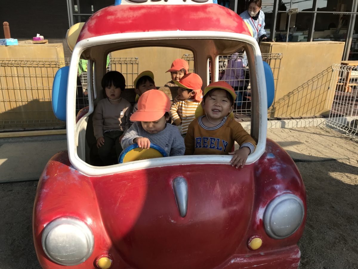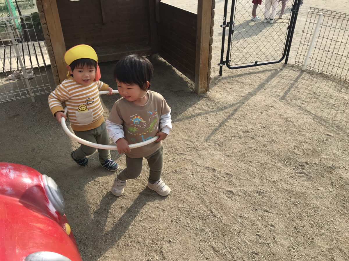 ガタンゴトンと言いながら仲良く園庭を走っているところです。