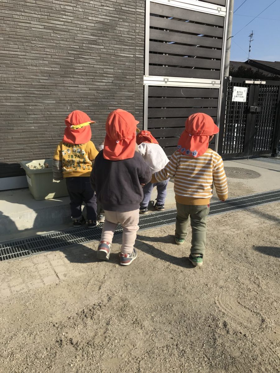 お友だちと手を繋いでお散歩に出発しました。畑のお野菜を見に行ったり寄り道をしながら進みました。