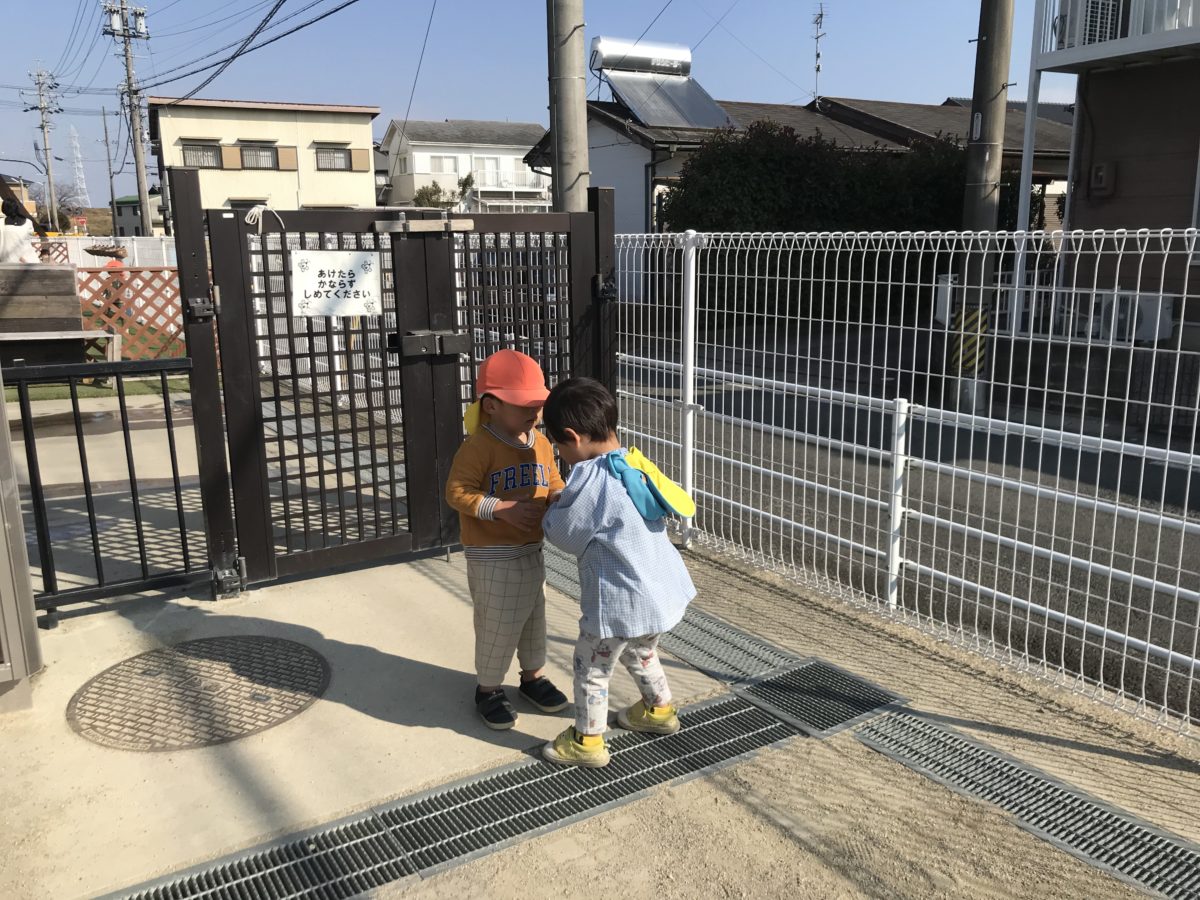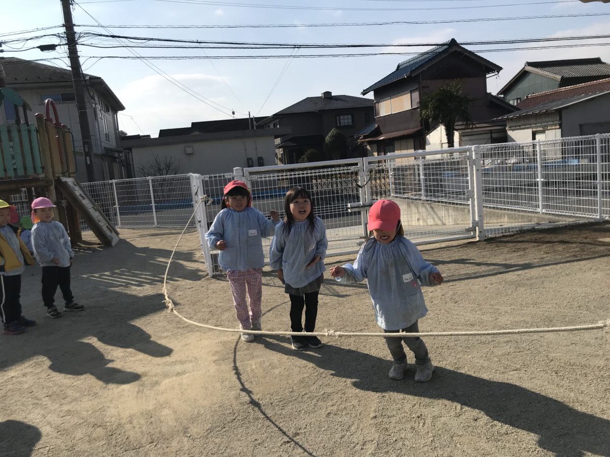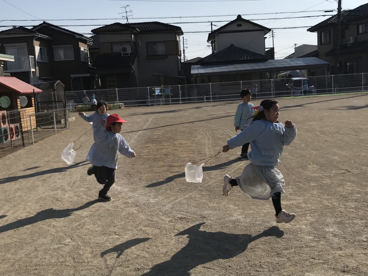 今日は先日作った凧を使い『凧リレー』を行いました。「ぼくリーダーする!」「わたしも!」とばなな組のお友だちが積極的にリーダーになり「めろんぐみさんは4にんまでね~!」「ちっちゃいこもいれてー」とチームのバランスがよくなるよう工夫したり、ばなな組のお友だちが困っているとめろん組のお友だちが「あとなんにん?」「いっしょにやろか?」と助けてあげる優しい様子がありました。凧リレーが始まると「きょう、かぜすくないからあんまりとばんな~」「バトンわたすのむずかしい・・・」と難しさを感じながらも最後まで走り切っていました。また、いつもだれが一番遠くへボールを投げられるかを対決していましたが、今日は「ジャンプでたいけつしよ!」との声があり誰が一番遠くへ飛べるか挑戦することに!はじめは線の上から両足飛びで跳んでおり、「ぜんぜんとべやんなー」となかなか遠くへ飛べず苦戦している様子。ですが、何度か挑戦するうちに「はしったらとおくにいけるんちゃう?」「こうやってとんだら?!」とお友だち同士で相談しながらどうしたら遠くまで飛べるのか考え合う真剣な姿がありました。