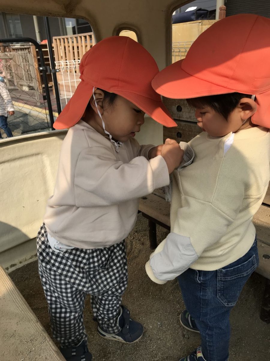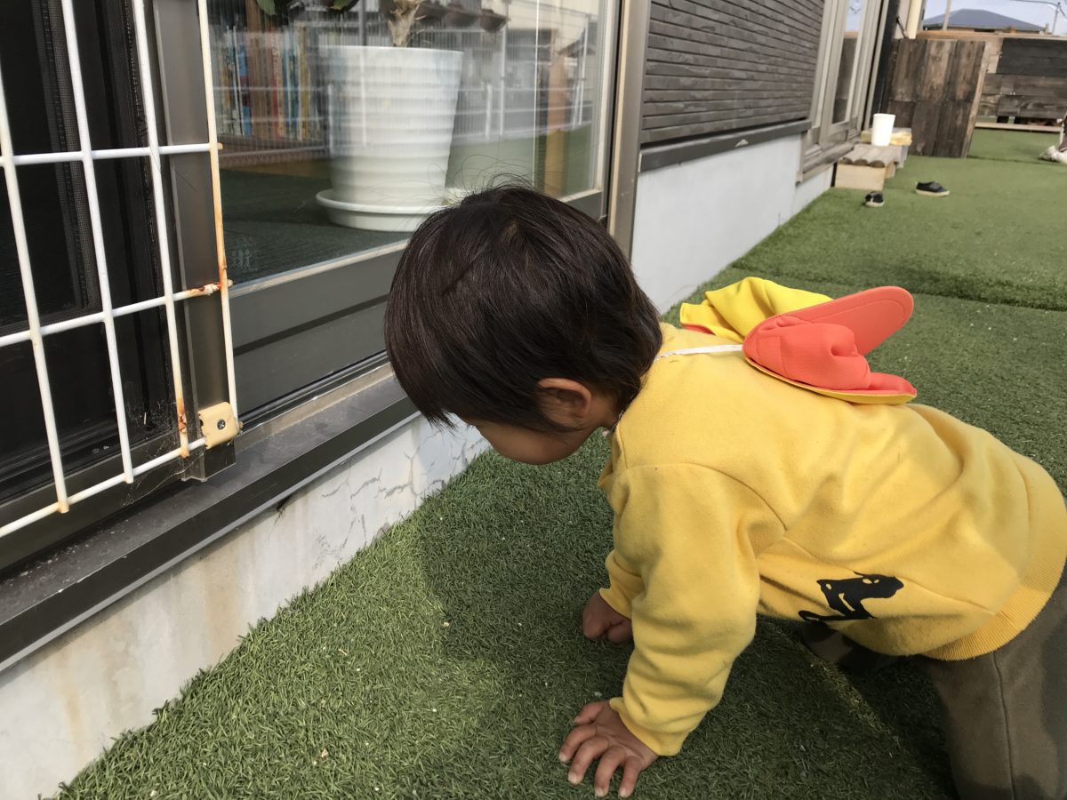 カラーボックスでおみせやさんごっこをしていました。「ジュースどーぞ!」とお友だちに手渡すと一緒に「かんぱーい!」と手を合わせていました。少し広い園庭で遊んでいたお友だちは、壁に虫がいるのを発見!「むし~!」「むしおった!」とお友だちと一緒に虫を追いかけていましたが、虫が逃げてしまい悲しそうに「ばいばい」と言っていました。