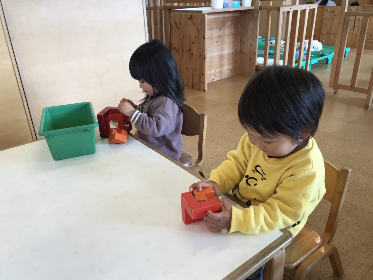 お部屋では立体の四角形になるブロックを使って遊び、どこにはめたら四角形になるかな?とブロックを夢中になって組み合わせている姿がありました。