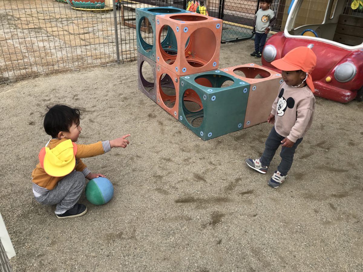 外の風景を室内から眺め、「お外行ける?」と聞きに来てくれました。行けるよう!と伝えると行ける!行ける!とお友だちにも伝えに行っていました。靴を早く履けるようになって、自分の帽子を見つけて被り、とても意欲的な姿がみられます。ボールを見つけると、蹴ったり投げたり、その内に周りにお友だちも増え、一緒にかかわる姿が見られました。「次はあっち!」と指さして相談したり、とても楽しそうでしたよ。また、これ何かな?と想像して会話を楽しんでいる姿も可愛らしく微笑ましかったです。明日はどんな姿が見られるでしょうか?これからもっと、こんな姿が見れると思うと楽しみです。