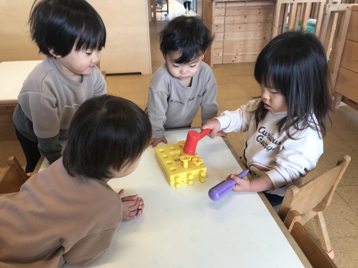 かなずちでトントン!と、真剣に打っていました。「何作っているの?」「なんだろうね?」・・・といろいろ想像しながら、会話を楽しんでいましたよ。