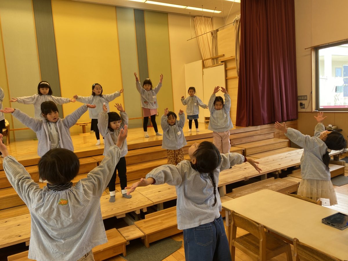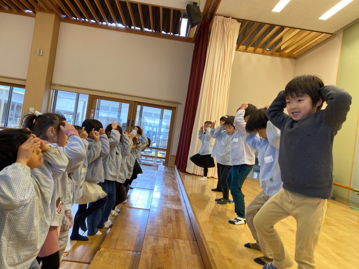 鬼役になりきり鬼ダンスを楽しみながら、劇遊びを楽しんでいました。振り付けのアイデアを出し合う姿が見られました。