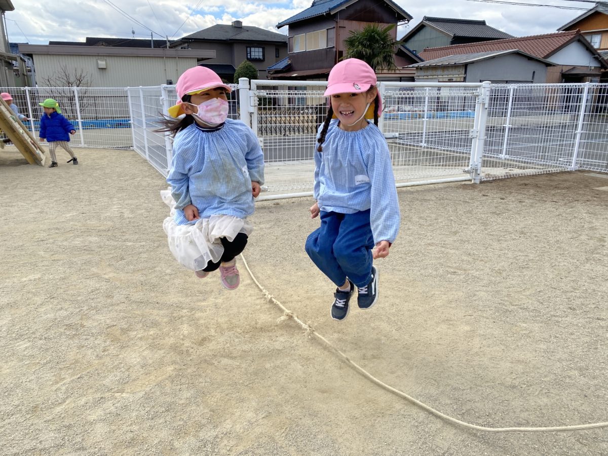 二人で大縄跳びに挑戦!!だんだんと立て並びから横並びへ跳ぶうちに変化していましたが、ひかからず記録更新されていました。