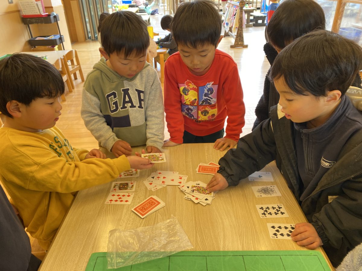 トランプでは昨日からいつもの神経衰弱ではなく「スピード」に挑戦中です。他のお友だちもルールを覚えようと真剣に見つけています。