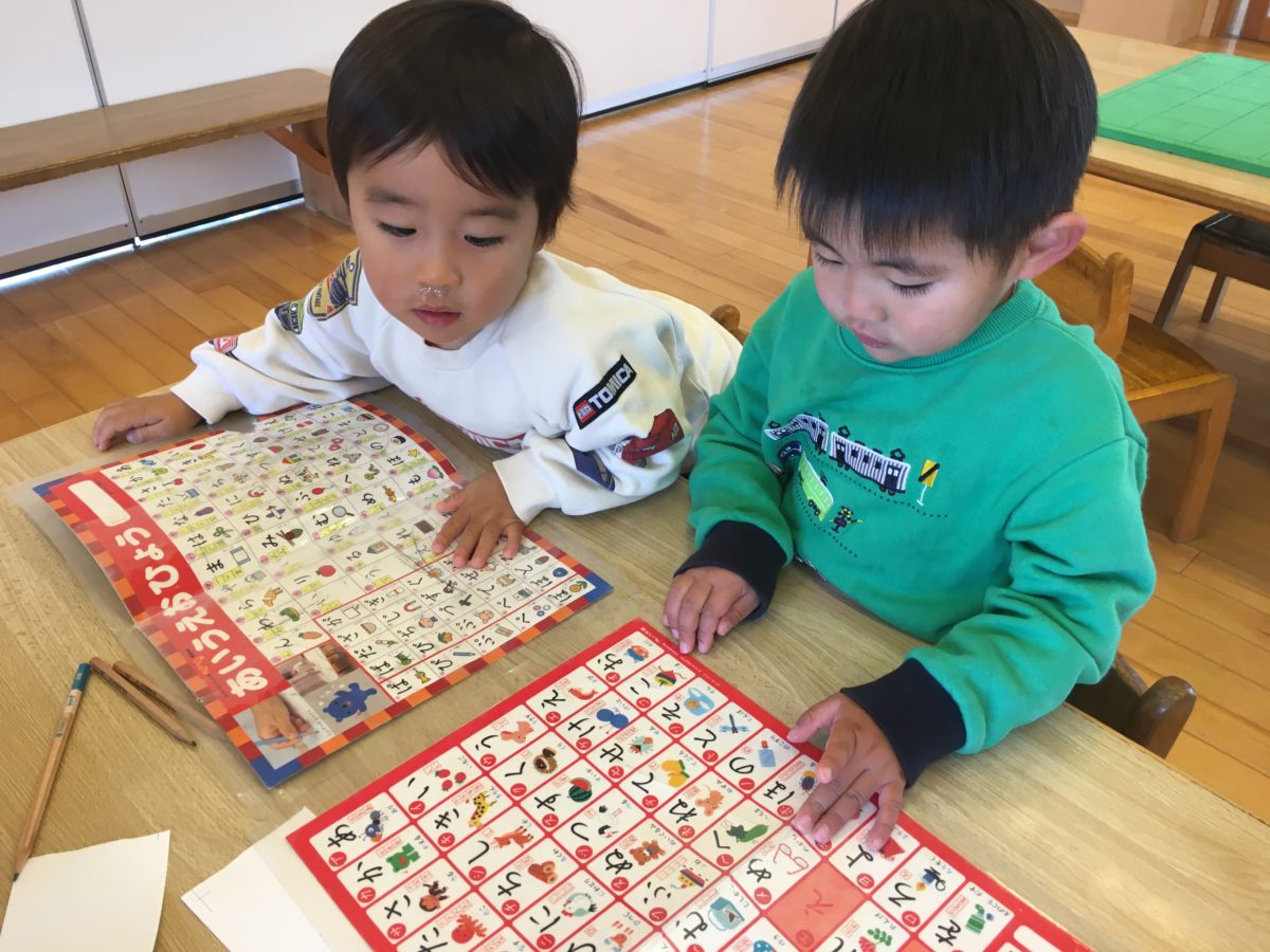 「なにがかいてあるんやろ?」とりんご組さんがひらがなの表を見ていると「あっ!みて~せみー!」と文字の下に載っているイラストが気になった様子。
