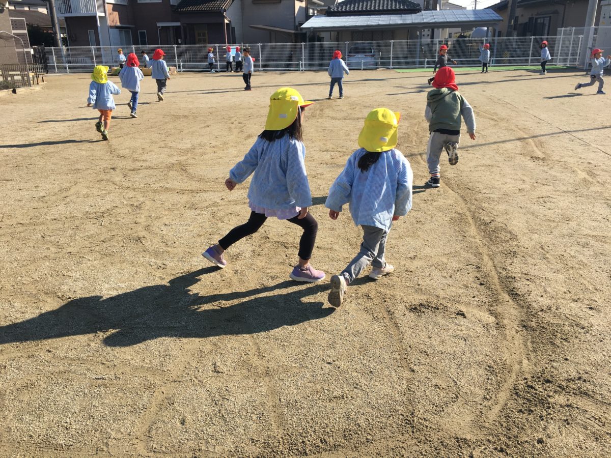 園庭では線おにごっこをやりました。「せんのうえしかとおったらあかんのやで」「ここにもせんかいちゃおうかな?」「まてー!あっ!そっちにジャンプされちゃったからタッチできやんだー!」と鬼から逃げるために線を増やしてみたり、別の線へ移動したりと手段を考えていました。
