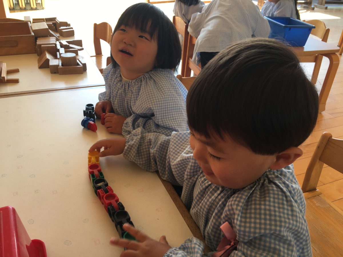 今日は卒園進級記念撮影があり、その時につけた名札を終わった後に取ろうとする子どもたち。「ここをさげたいのに、なかなかうごかないよなー」「かたーい」と思っていたよりも名札のピンが硬く、困っている様子の子どもたち。すると「ぼく1かい○○くんのとってみよっか?」とお互いに外しあいをしようとしましたが、なかなか硬く苦戦していました。お部屋にあったひらがなの表を見ながら「これなんだろう?」と見始めたのはりんご組さん。すると「みてーここにせみがのってる。」と文字の下に載っていたイラストに興味を持っていました。また、さくらんぼ組さんは、おままごとのおもちゃを使いながら、「こっぷにみかんいれたらみかんじゅーすやな。」「こっちはれもんいれたでれもんじゅーす」「れもんじゅーすすっぱそうやな。」とお店屋さんごっこでお友だちとの会話も楽しんだりお店屋さんになり切って楽しむ姿もありました。