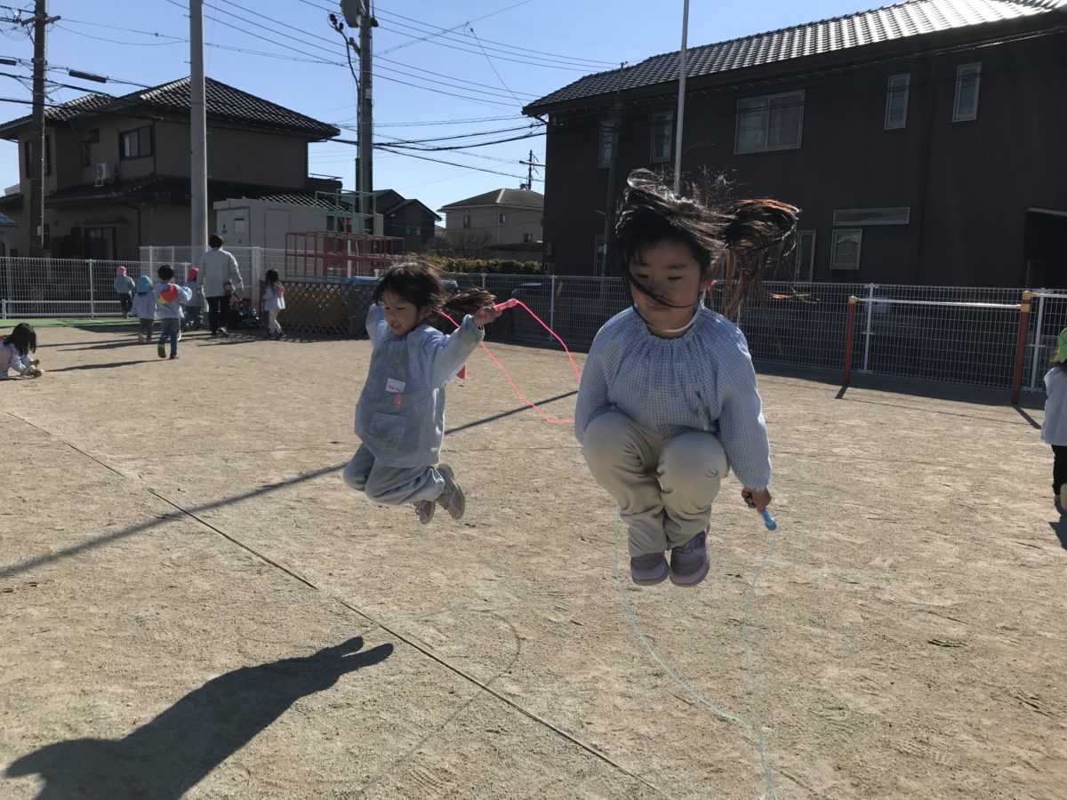 先月位から大縄跳びと一緒に縄跳も跳べるようになりたい!とコツコツと頑張って飛ぶ練習をしていた子どもたち。縄跳も多く跳べるようのになってきました。