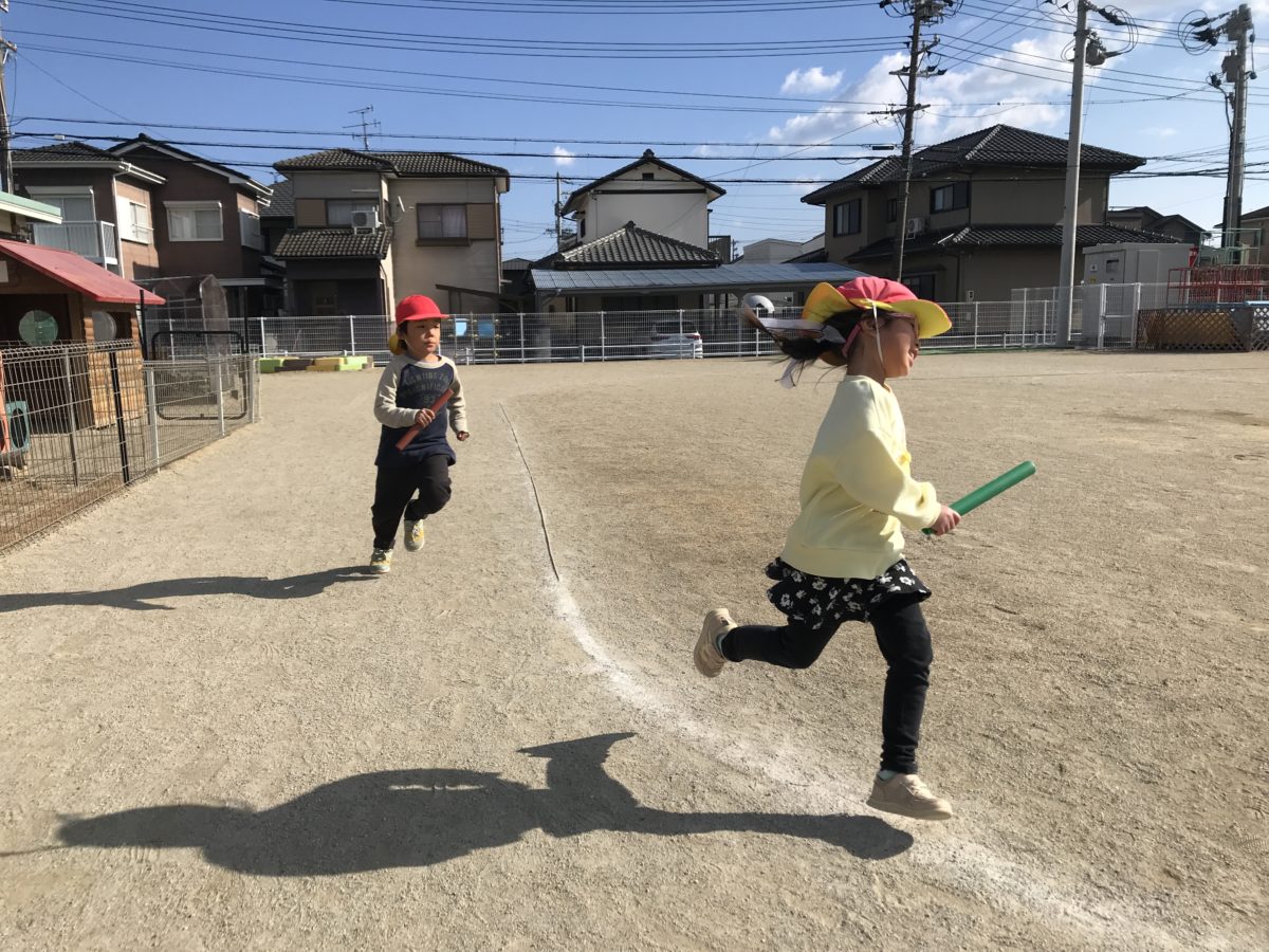 大きい子たちは今日も白熱したリレーを見せてくれました。勝ち負けも最近気になるようで、「もっとー!ぬかせるー!ダッシュー!!」「いけー!」「○○ちゃんぬかしてー!」「がんばれー!」と応援するのにも力が入ってきました。また走っていて抜かすことが出来なくて悔しっかったりするのか、「ごめんぬかせやんだ!」と次に走る子にバトンを渡しながら話したりしていて、子どもたちのやる気や気持ちが近くで伝わり、感動しました。これからも子どもたちのやる気などを応援していきたいと思います。