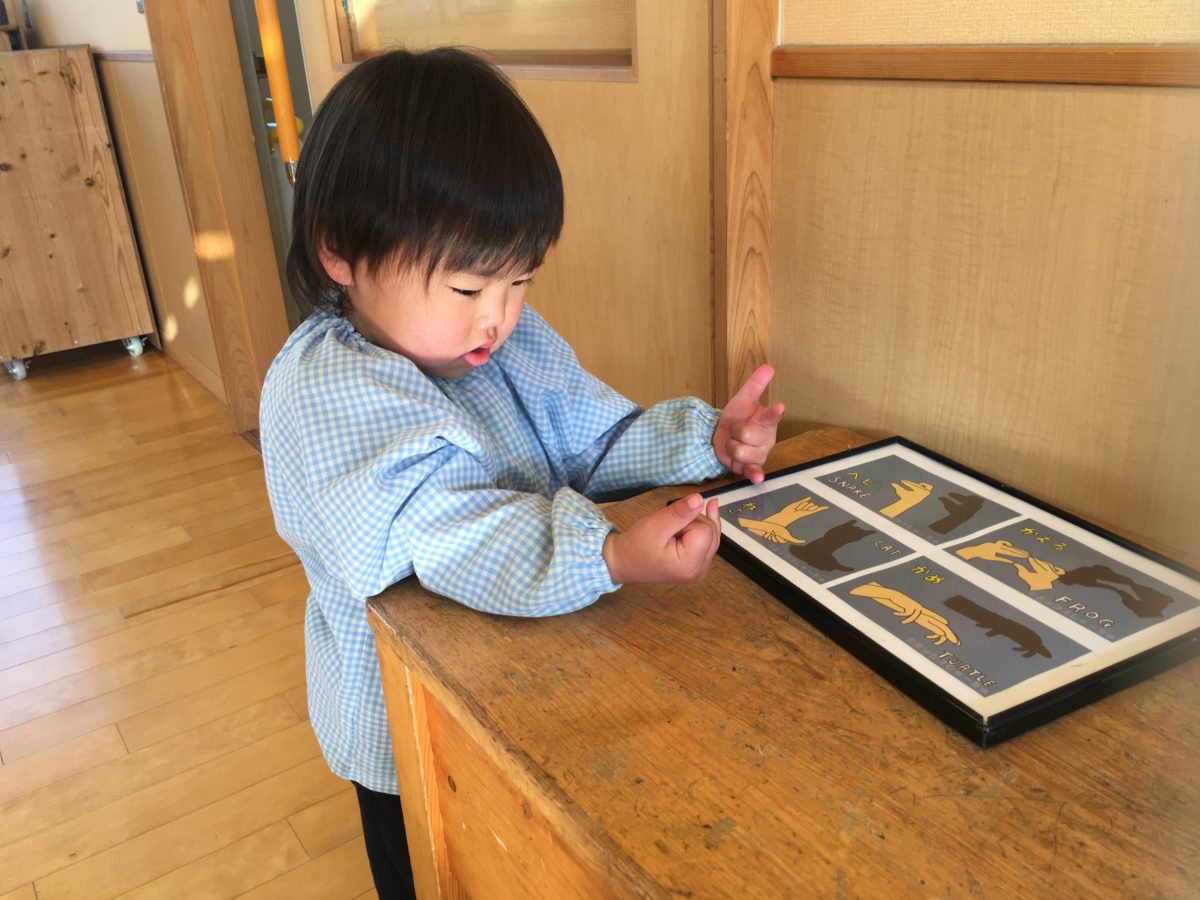 どうやってするのかな?とかげ絵のイラストを見ながら手の形を真似していました。
