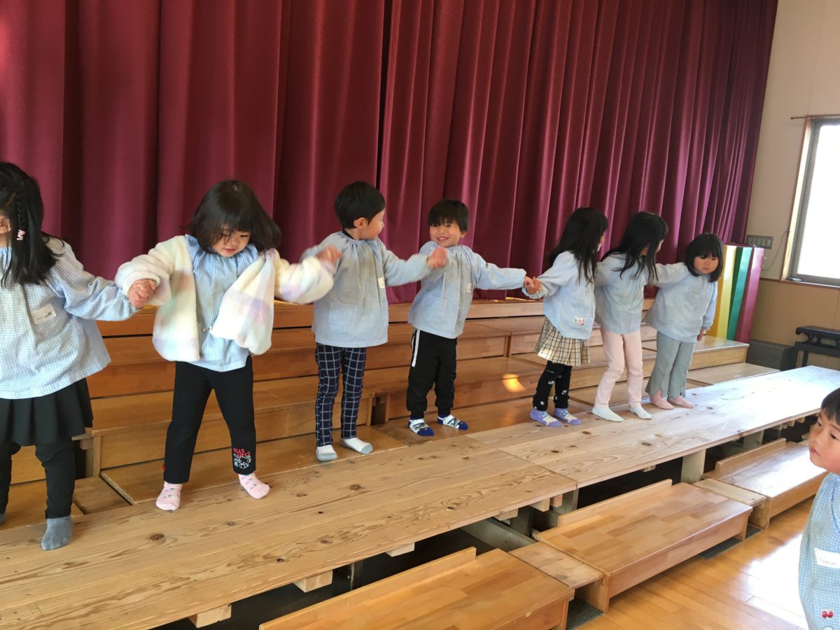 舞台でダンスを楽しんでいたさくらんぼ組さん。お友だちと手をつないで踊っていた時には、少し照れている表情の子もいましたが、お友だちと顔を見合わせながらとっても素敵な笑顔になっていました。お部屋では、「むろぐらむつくりたいな!」とお友だちが作っていたのを見て、やりたくて仕方がない様子の子もいました。糊で台紙に貼る前に「めをほしがたにしよっかな!」と顔のパーツを並べていると「それいいね!」と一緒に作っていたお友だちがちょっとのぞき見。みんな自分のを作りながらお友だちがどんなものが出来ているのか気になっているようでした。園庭では、りんご組のお友だちがかけっこを楽しんでいました。「よーいどんしよ!」と誘ってみたり「もう1かいやろうよ」と何度も競争を楽しんでいました、ばなな組のお友だちもフラフープとボールを使ってボール投げを楽しんでいました。「ここにとおしたら、かちな!」とフラフープをゴールに見立てて投げて遊ぶルール自分たちで作って遊びを楽しんでいました。フラフープが低いとすぐにボールがフラフープを通ってしまうため、「もっともっとたかくして!」とお友だちとさらに遊びを楽しめるように工夫をしていました。