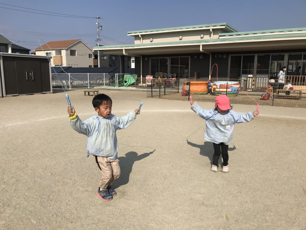 「縄跳び何回跳べる??」「数えて!数えて!」と縄跳びの回数をお互いに数えあっていました。