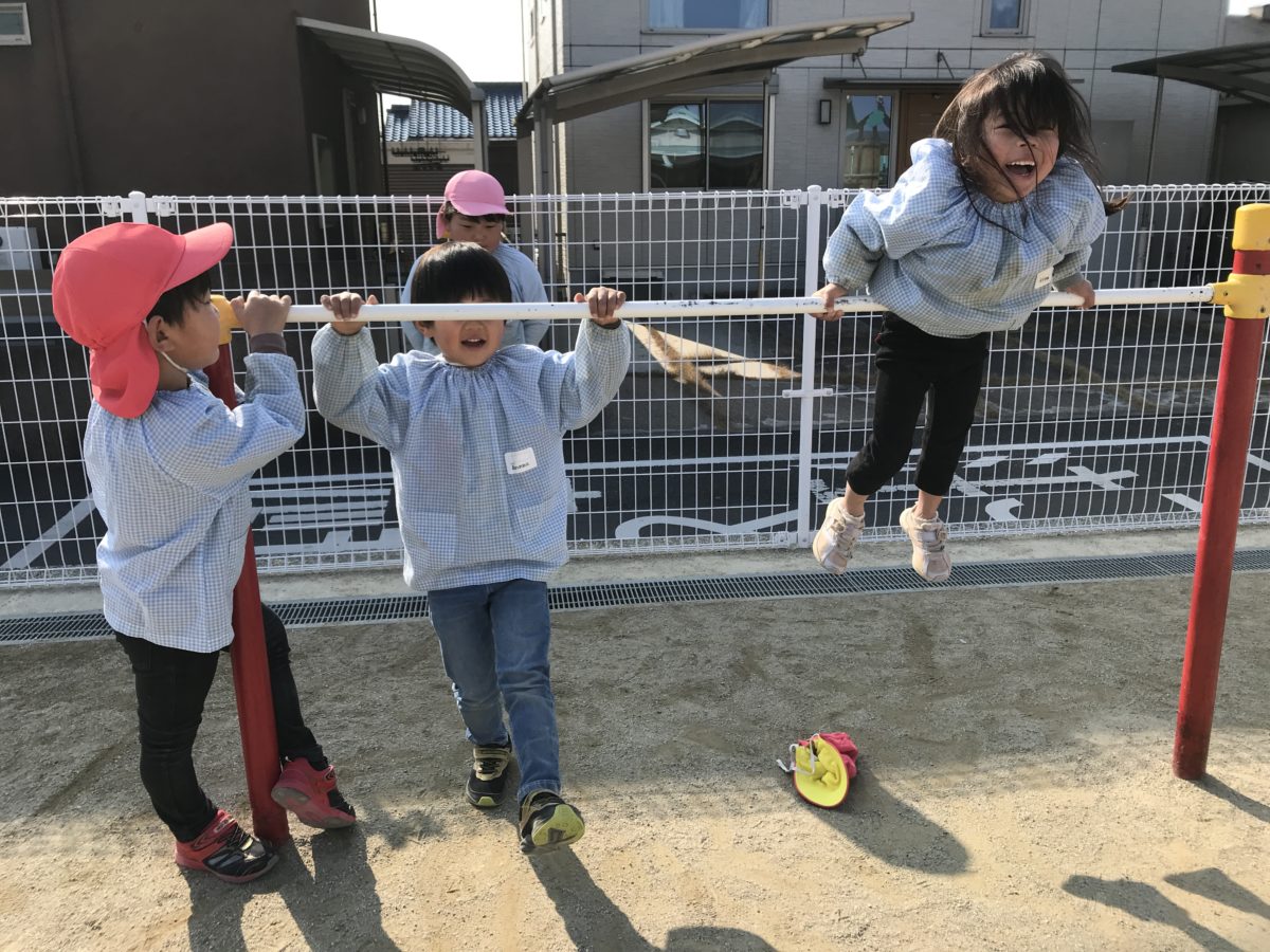 鉄棒にめろん組のお友だちが挑戦しているのを見ていたばなな組のお友だち。自分たちもやってみたいと思ったようで前回りをしようと何度か挑戦。前から前回りを得意としているお友だちが自分も前回りをしながら、「こここう!ジャンプしてこう!」と教えてくれて「え?これであってる?」と言いながら前回りに挑戦してました。まだ少し時間は必要かもしれませんがやりたい気持ちを大切にして見守っていきたいと思います。