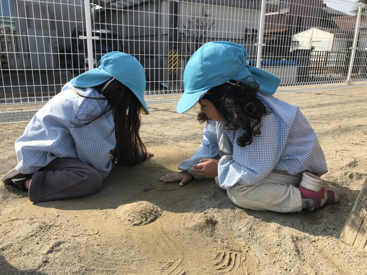 大きい子たちは戸外に出る時に「今日ハンター鬼ごっこしたい!!」と以前やった鬼ごっこをやりたいというリクエストがあり、自分たちでルールを決めて鬼ごっこをする姿がありました。ハンター役の子が鬼になって後のお友だちを捕まえていく。捕まったお友だちからハンターに数人ずつなっていく…というルールでスタート。捕まりたくなくて猛ダッシュするお友だち。捕まった後には鬼になって復活していくので、そこも楽しいようでゲームオーバーになっても、「もう一回やるー!」と言って、もう一度鬼決めから再開してました。「おれ最後まだ残ったで!」「こそこそしてたら捕まらなかった!」と逃げ切れた事をお友だち同士で話したりして、「またやろなー!」と最後には次の約束もしていました。