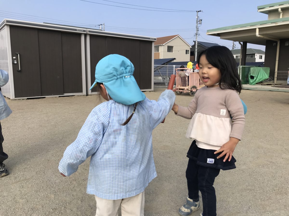 最近運動遊びが好きな子どもたち。りんご組のお友だちはリレー用のバトンを持って「よーい、どん!!」お友だちと一緒に走ったり、バトンを待っているお友だちにバトン渡して、何周も何周も走ってました。