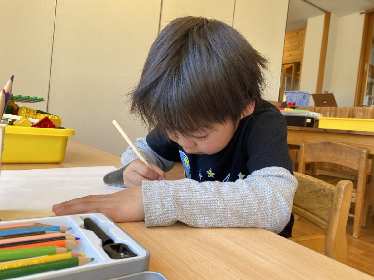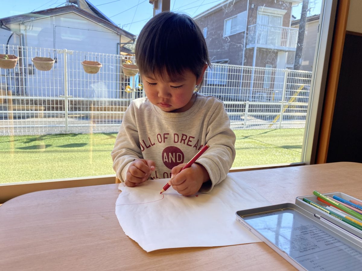 ブロック遊びを終えた後は、「おえかきするの」とこんな声から紙と色鉛筆を準備してみることにしました。「ぼくあかにする!」「〇〇くんはちゃいろ!」と好きな色の色鉛筆を手に取ると、みんな真剣に紙に何かを描き始めていました。線を描いたり、色を塗ったり・・・。「できたー!」と紙一面に描かれた電車や線路。じっくりと出来上がったイラストを眺めたりお友だちに見せてみたり、はさみで電車のイラストを切り取ったりしながら楽しんでいました。