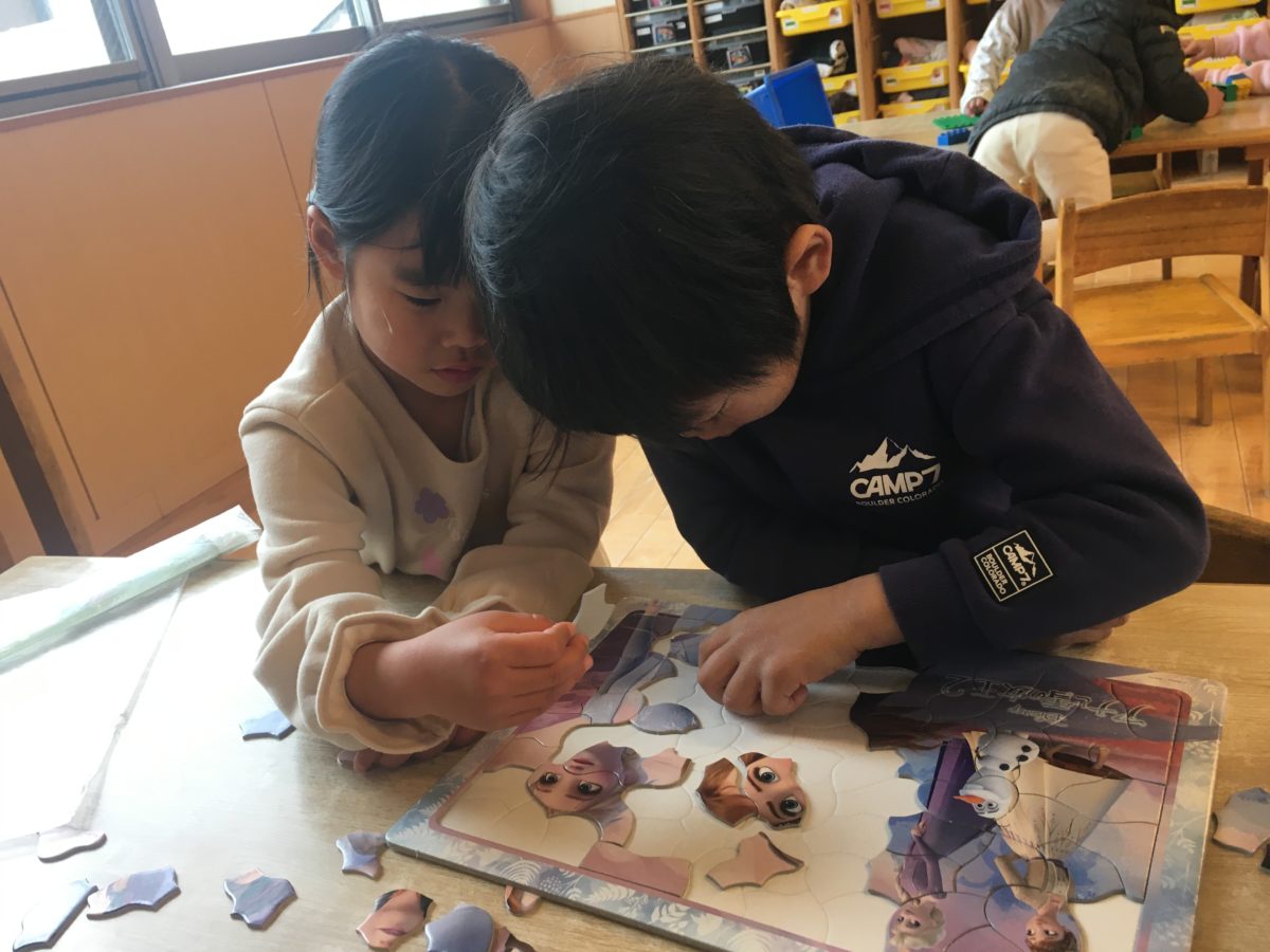 みんなが使った後のハンドベルを片付けようとしていたお友だち。「どうやってしたらつぎつかいやすいかな?」とたくさん並んでいるハンドベルを見ながら、「そっか!おとでべるをわけたらいいんかも。」と種類に分けたベルをかごへしまっていく子どもたちの姿があり、次使いやすいようにどうしまっていくべきかを考えていました。そしてお部屋では、ピースの多いパズルに挑戦する子どもたちの姿があり、「これどこ?」「ぼくのはここやったわ~どれどれみせて。いっしょにかんがえてみよ!」とお友だちと協力をしながら1つのパズルの完成を目指しているようでした。園庭では、かけっこで自分が何秒で1周走り切れるのかが気になったようで、「ちょっとかぞえて~」とスタートと同時に走り出し、一緒にいた子が数える姿がありました。「えっとね、○○くんは11びょう!」「○○ちゃん13びょうだったよ!」「ってことはぼくのかちやな!」と秒数でもどちらの方が速く走れたかをすぐにわかっている様子がありました。また時計を見ながら「いまこれなんじ?12と5だから・・・1じ5ふん?」「12じ5ふん?」「なんじやろう?」と少し時計にも興味を示している様子もありました。短い針と長い針の区別がまだ難しく読むのはちょっと難しかったようでした。すると「うん?1こすすんだから、もしかしたらいま、12じ6ぷんなのかもしれない!」と普段から時計を見ていることもあり、針が1つずつ進んでいくことがわかっているようで、時間の読み方に気が付いたようでした。