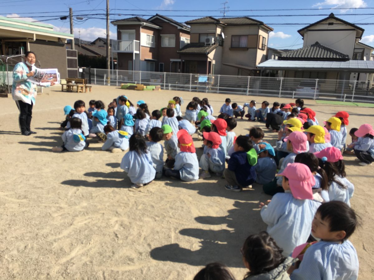 今日は避難訓練でした。30年前に起こった阪神淡路大震災がちょうどこの1月にあった事。その時の写真や、自分が実際に三重県に住んでいても、揺れて飛び起きた話などをすると子どもたちも食い入るように話を聞いていました。またその時の写真を用意して、みんなで見られるようにお部屋に置いておくと、「あー!これさっきのお話の写真!」と言って数人のお友だちが交代で見に来ており、「車がすごいことになってる!」「海に連れてかれてる。」「お家がぐちゃぐちゃ。」「地震ってこわいね。」「何にもなくなってるね。」と写真を通して子どもたちは子どもたちなりに思うことがあるようで、真剣な眼差しで写真を眺めている姿がありました。お友だち同士でも、「地震の時は揺れてるときは動いちゃダメなんだよ!」と注意事項の再確認等して、改めて地震は怖い、もしも起こったらどうしていったらいいのかを一緒に考える機会となりました。
