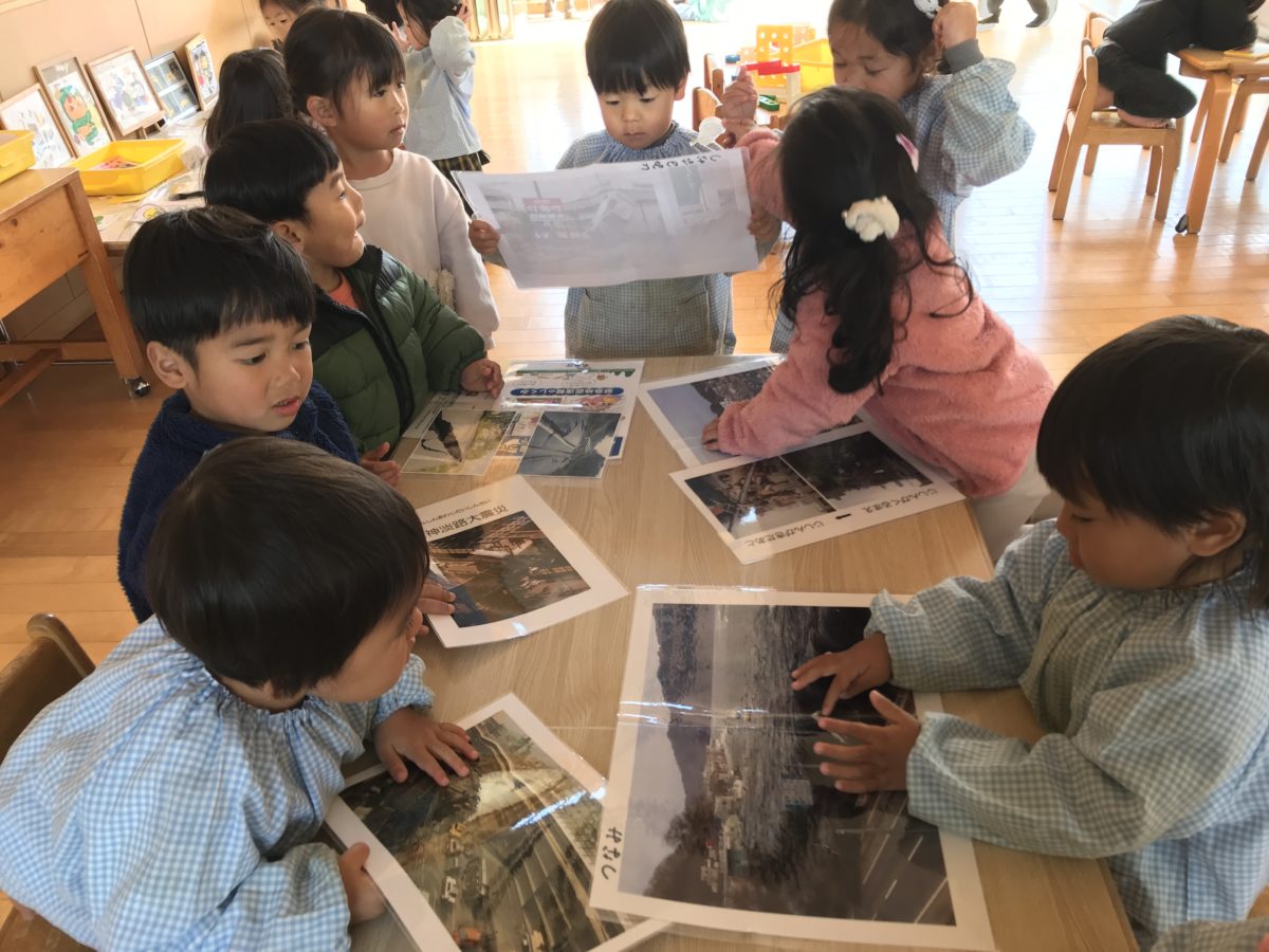 避難訓練で見た阪神大震災の写真やと東北の地震の津波の写真など見て、「ほんとにやばいな。」「こんなん来たら怖い。」「逃げれるかな?」と様々な声が聞こえ、子どもたちなりに思う所があってお友だちと話す姿がありました。