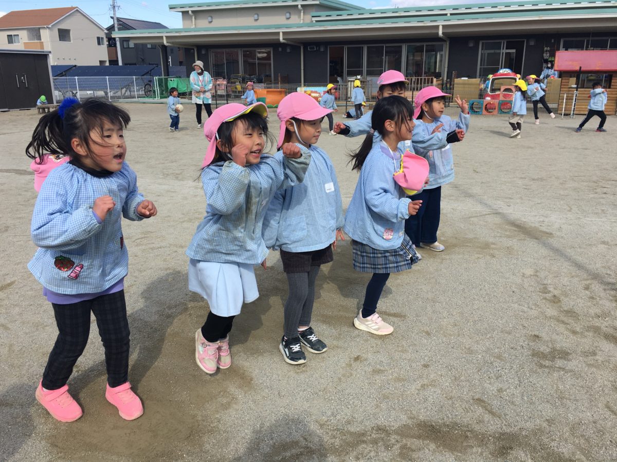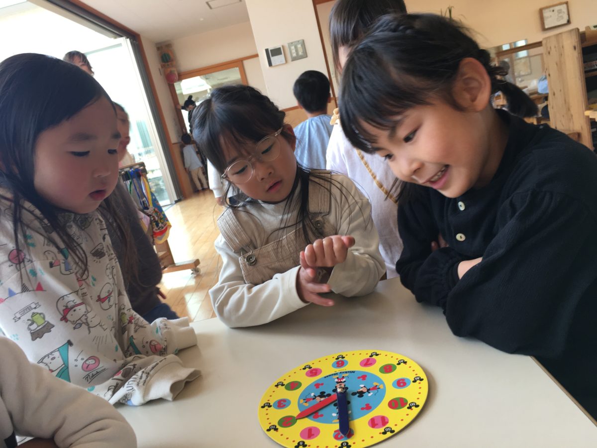 園庭で「きょう、はしりところのせんがない!」とトラックの線がないことに気が付いた子どもたち…「せんじぶんたちでかいてみようよ!」と線を書き「もっとかきたい。」から子どもたちは園庭に長い線が出来上がっていきました。すると「はしっこからスタートしてじゃんけんするやつしよ!」「ひさしぶりにやろうよ!」と子どもたちからアイデアが上がりました。2チームに分かれ、「よーいスタート!!」と出発し出会ったところでじゃんけん。「よっしゃーかったー!」とどんどん勝ち進んでいきますが、「あーまけた。○○くんはやくしゅっぱつして!」と相手チームが自分の陣地にちょっとでも近づかせないように早く出発するように声をかける様子もありました。しかしなかなか決着がつかず…!ですが「がんばってー!もうすぐー!!」とゴールが近付くほど子どもたちの応援する声にも熱が入っていました。そしてようやく「やったーゴール!」と相手陣地にゴールするとチームみんなで「よっしゃー!かったぞ♪」と喜び合う姿があり「もう1かいやろう!」と子どもたちも勝つか負けるか、ワクワクしたようで何度も繰り返し楽しむ姿がありました。お部屋では時計の模型を準備してみました。以前「どうやってよむんだろう?」と話していたこともあり準備しておくと「そっか!みじかいはりのほうが〇じでながいはりが〇ふんのほうがあたってるから、そうやってよむのかも?」と模型に書かれた文字を見て時計の読み方が分かってきたようで「さぁこれなんじだ?」と問題を出し合う姿などもあり、時計が読めたことで楽しさも得られ、その後にはみんなで問題を出しあうことも楽しんでいました。