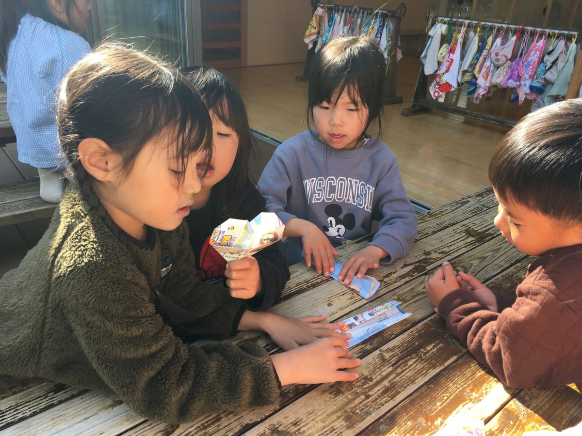 きのうおっていたハートの折り方を教えています。