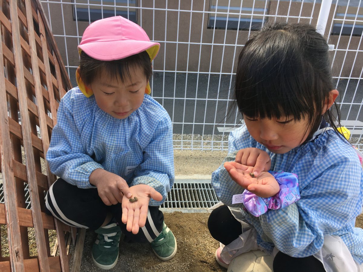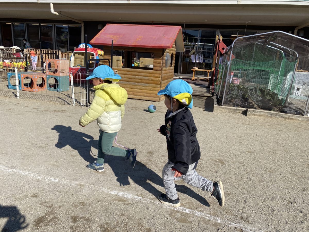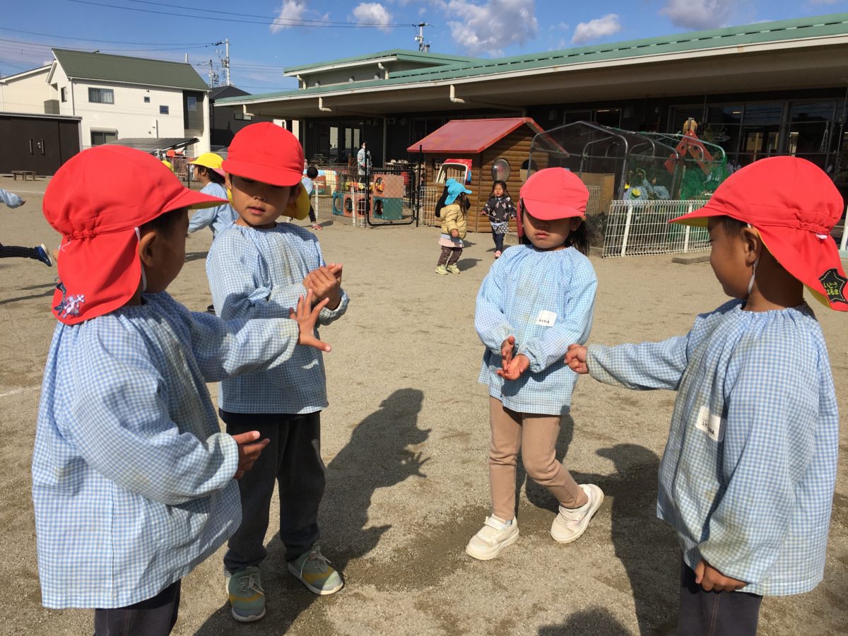 「きょうもきのうのつづきしたい!」と話すのはめろん組さん。すると「きのうのつづきってなに?だんご?」とめろん組さんがやろうとしていることに興味をもったのはばなな組さん。すると「せんのうえすすんであたったところじゃんけんするやつ!!」「それやりたいやりたい。いれてー!」とばなな組さんも一緒にやることになりました。「きのうはさつぎのこがだれかわからんかったから、きょうばとんをもってはしるようにしない?」と違うアイデアが生まれてきてきたり、「きょうはもっとながいせんにしよ」と昨日よりも長くすると…「たのしいけど、ぜんぜんごーるしない!」と長くしたことでじゃんけんをする回数が増えて、全然相手のところまでたどり着かず「これ、あいてのところにごーるするんかな?」と話していた矢先にようやくゴール!!みんなで拍手をして喜び、今日も盛り上がったヘビじゃんけん。昨日から少しルールを変えながら、子どもたちも楽しむ姿もあり今度はどんな展開になるのか楽しみです。