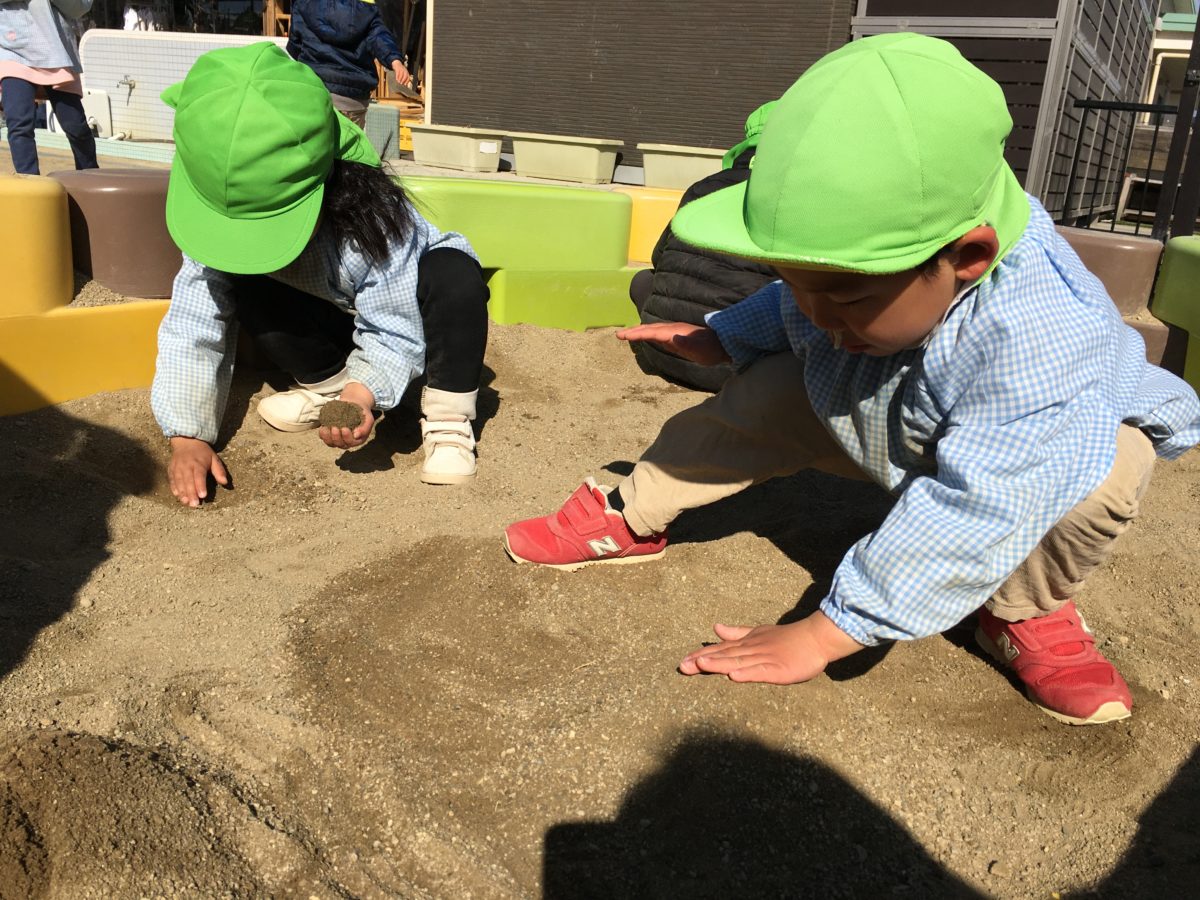 「すながこおってる!」「これもこおってる!」とかげになっていたところの砂が凍っていたのを発見!!