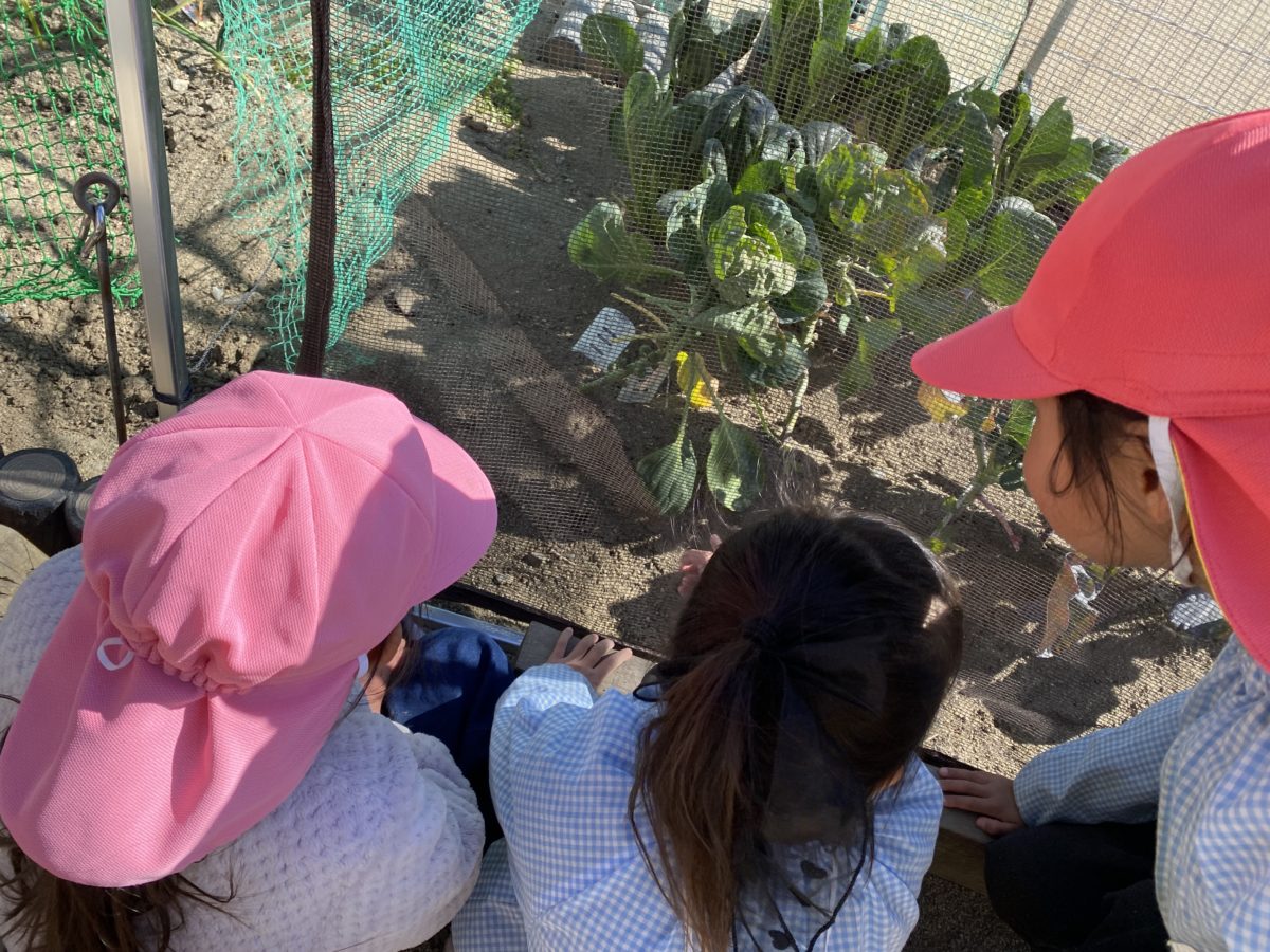 フラフープできるようになったよ!!の声がよく聞こえてくるようになり、見せ合いっこをしているうちにどちらが長く回せるかな!?との勝負に発展していました。「いーち、にー、さーん・・・」と周りのお友だちが元気に数えながら応援して、対戦中のお友だちは腰や膝を使いながら真剣な表情を見せていました。「数え方がはやい!!」との声も聞こえていました。園庭の畑では芽キャベツの茎にもこもこした新しい芽を発見して、不思議そうに観察していました。砂場ではそれぞれのお店屋さんが開店されており、「これ、いくらですか?」と会話したり、フラフープを電車に見立てて「でんしゃにのってみんなでおみせにきたよ!」などお友だちが集まったりしていました。小石をお金に見立てて園庭から集めてくる姿もあり、様々な姿で楽しんでいました。